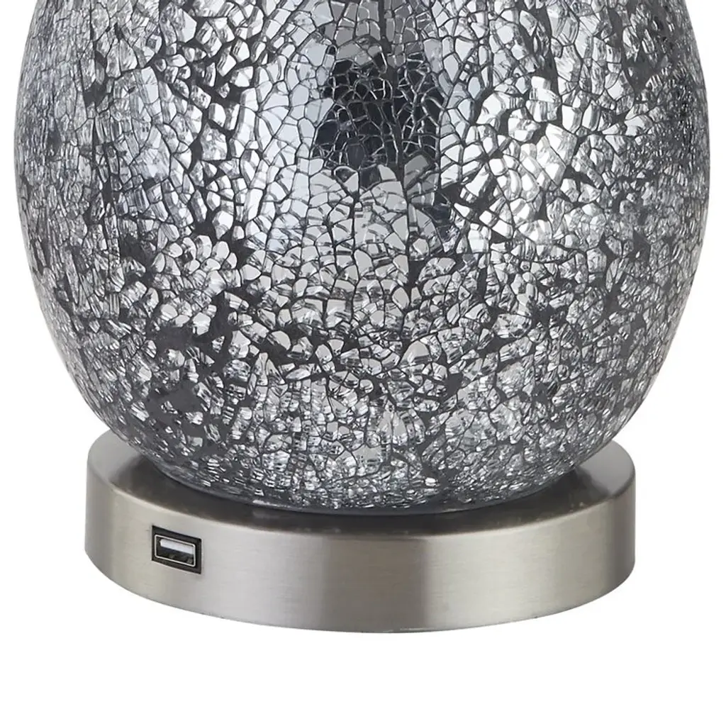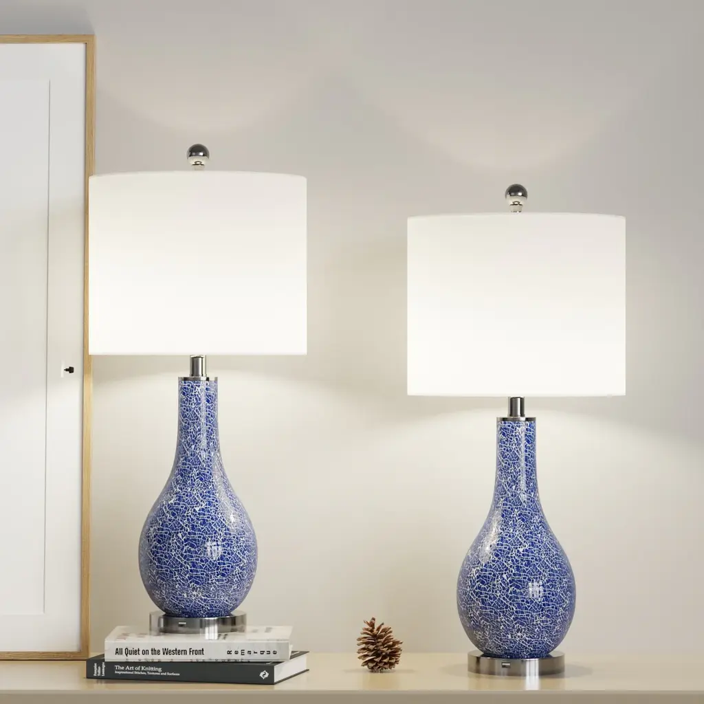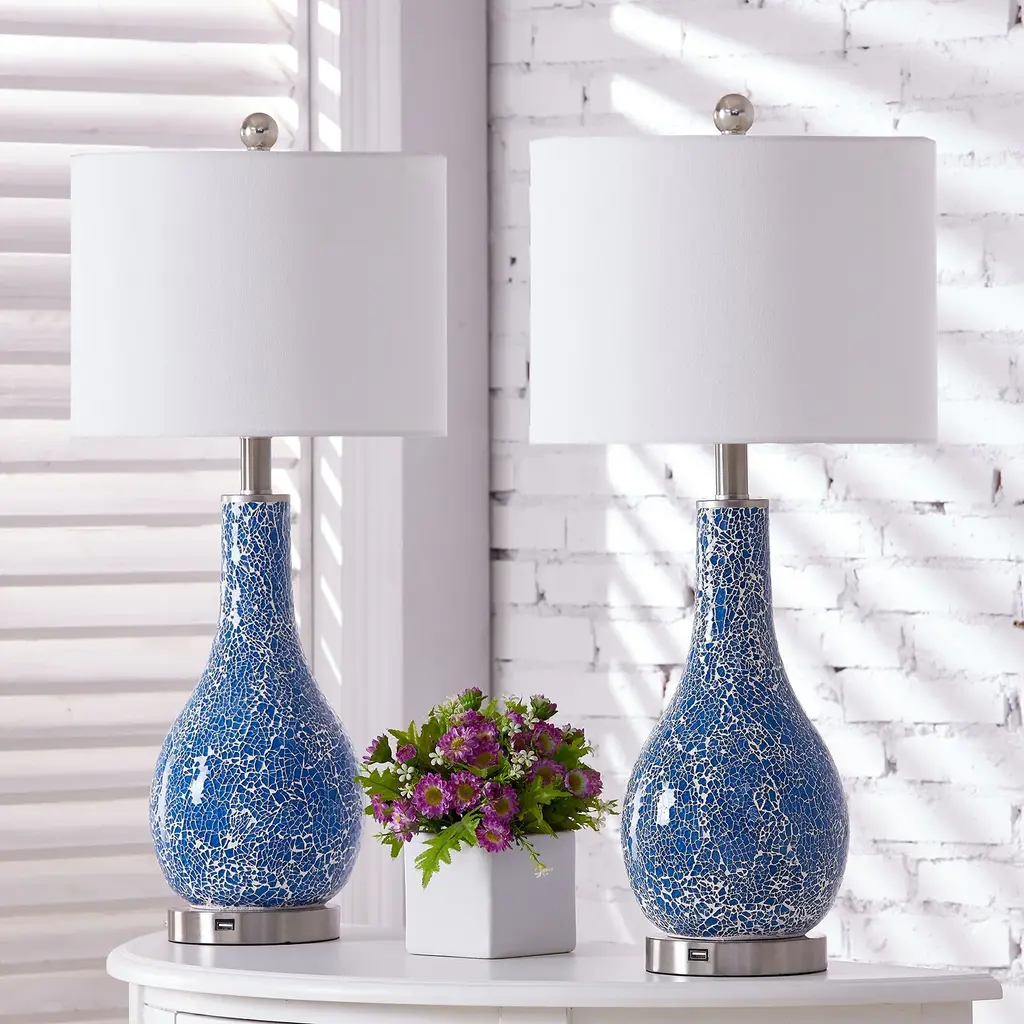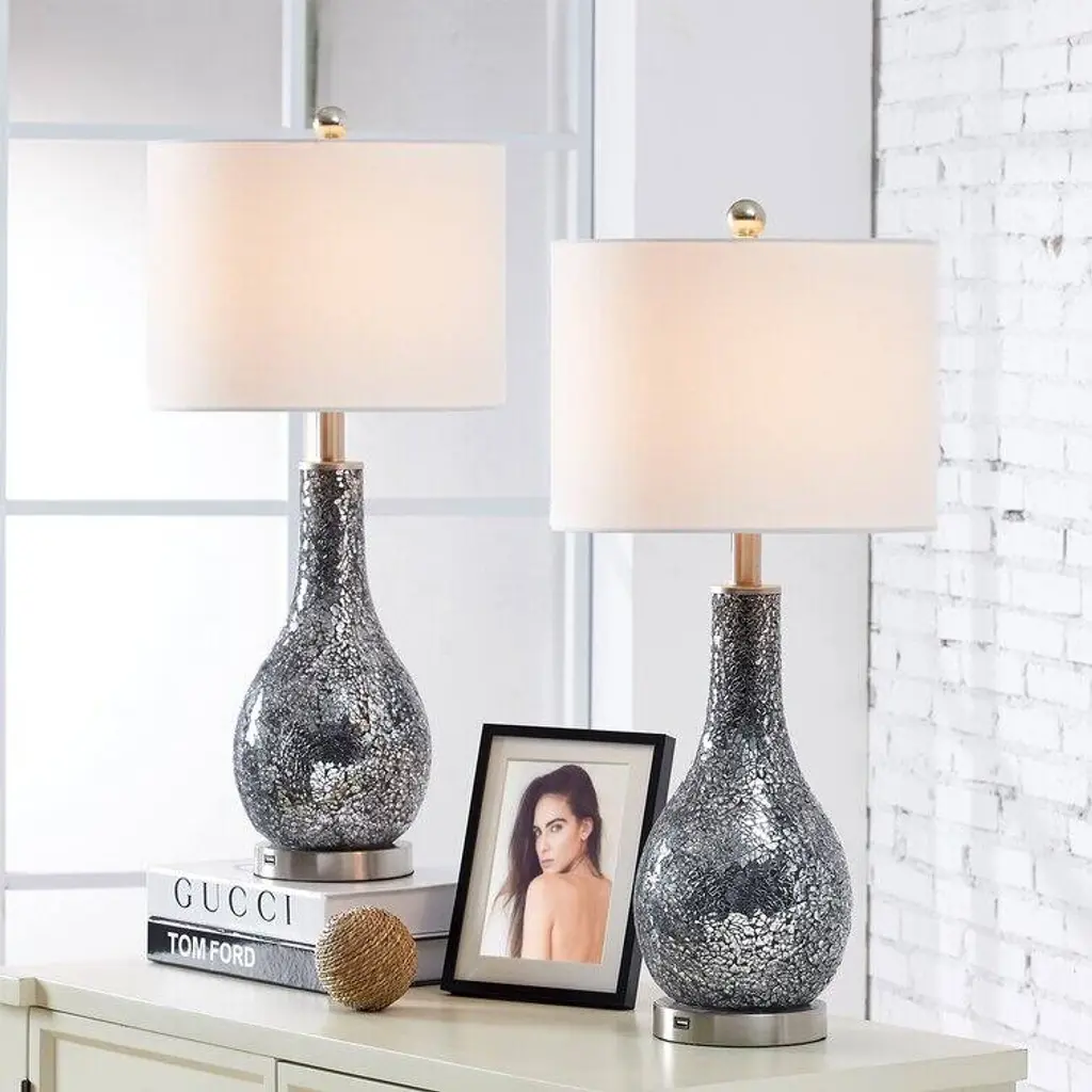This 2-piece set of bedside table lamps light up your space with fun texture and boho flair. Both are crafted in teardrop shapes with a unique crackled effect that reminds us of mercury glass. The circular metal bases have built-in USB ports ideal for charging your phone or tablet while you're reading or watching TV. The simple drum shade and finial top allows the body of the lamp to really fantastic. Each lamp takes one standard bulb (Not included).