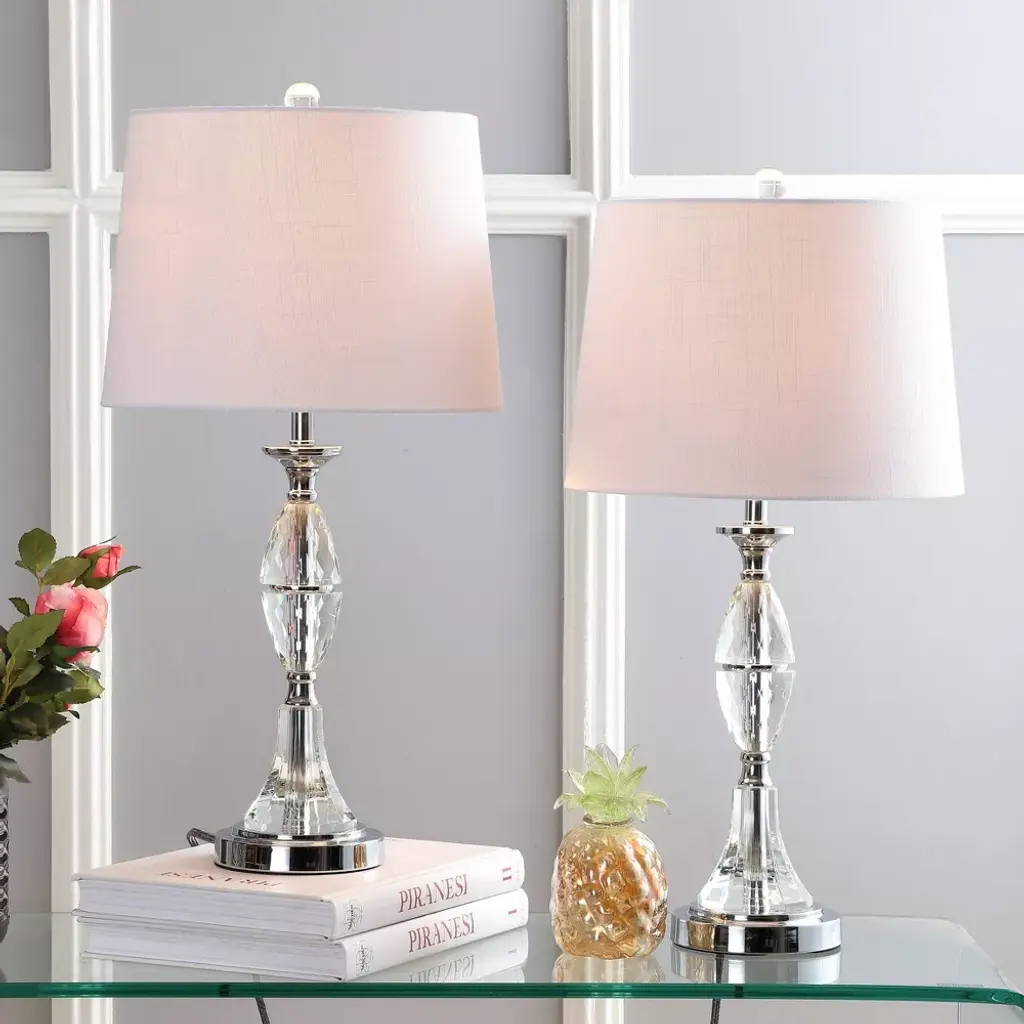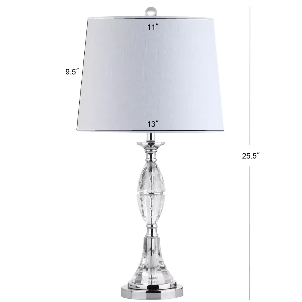 Refresh your decor with this striking crystal table lamp. The modern look features a slightly tapered shade atop a clear fluted-crystal base. A clear winner, this lamp stands out for its finishing touches -- a crystal finial, chrome fittings, and a 60 silk-wrapped cord complete the look. Classic crystal styling works with any style of décor or color scheme. 100% cotton hardback tapered drum shade. 60 silk cord with standard USA 2-prong plug. On-off switch on socket. Takes one maximum 100 watt or equivalent bulb. Eco-friendly 9W LED bulb included. UL Listed. Before cleaning any lamp shade or fixture, disconnect the power source. Wipe with a soft, dry cloth. Avoid the use of chemicals and household cleaners as they may damage the finish.