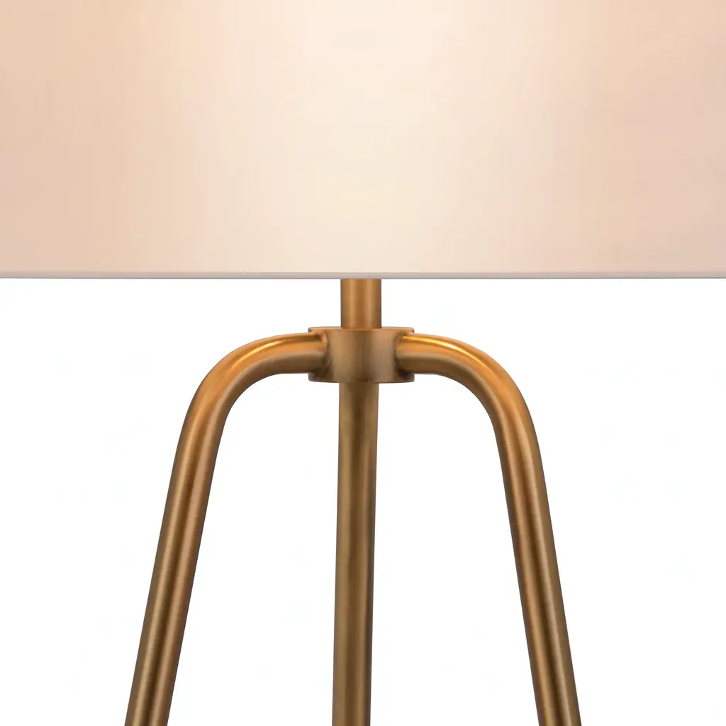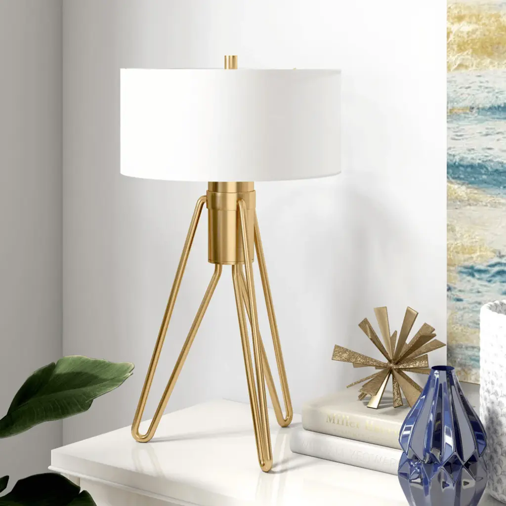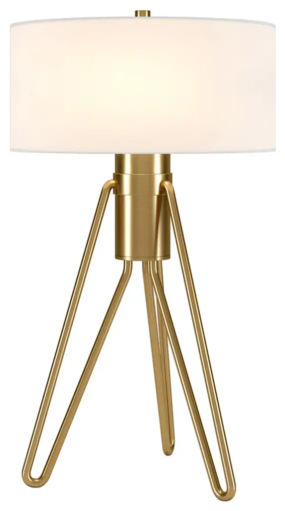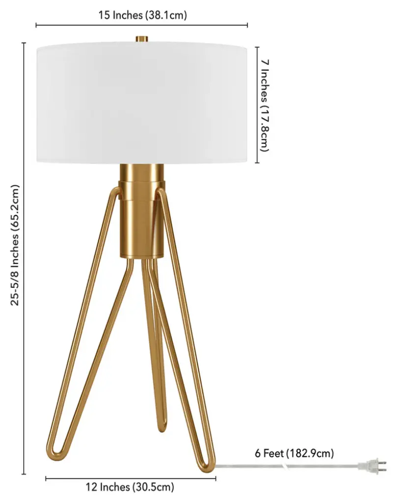 This 25-inch brass metal two light tripod table lamp with white drum shade is the perfect combination of design and function. The lamp is made of sturdy metal and features a brass color. The white shade has a drum shape and is made from fabric. A tripod base gives this lamp a unique and modern profile. The light that this lamp throws is soft and warm to elevate the look of most any space in your home. It is perfect for virtually any decor. 25-inch H x 15-inch W x 15-inch D