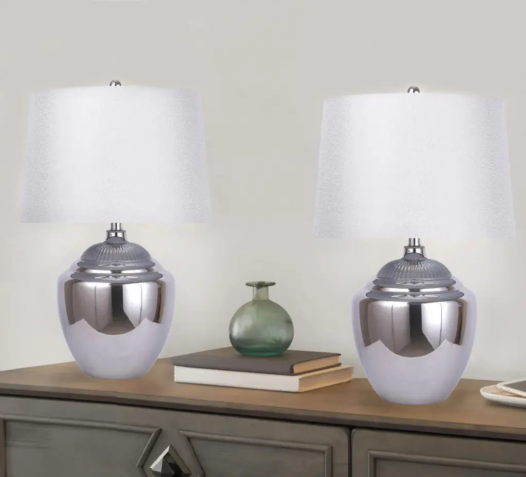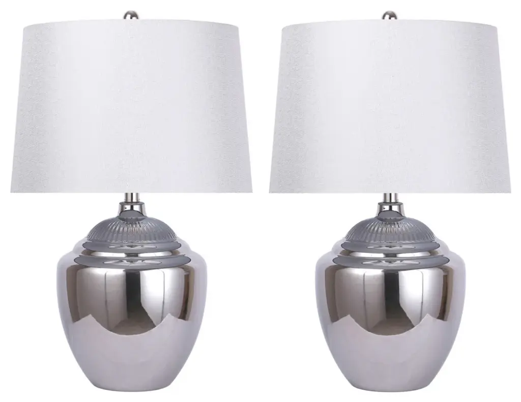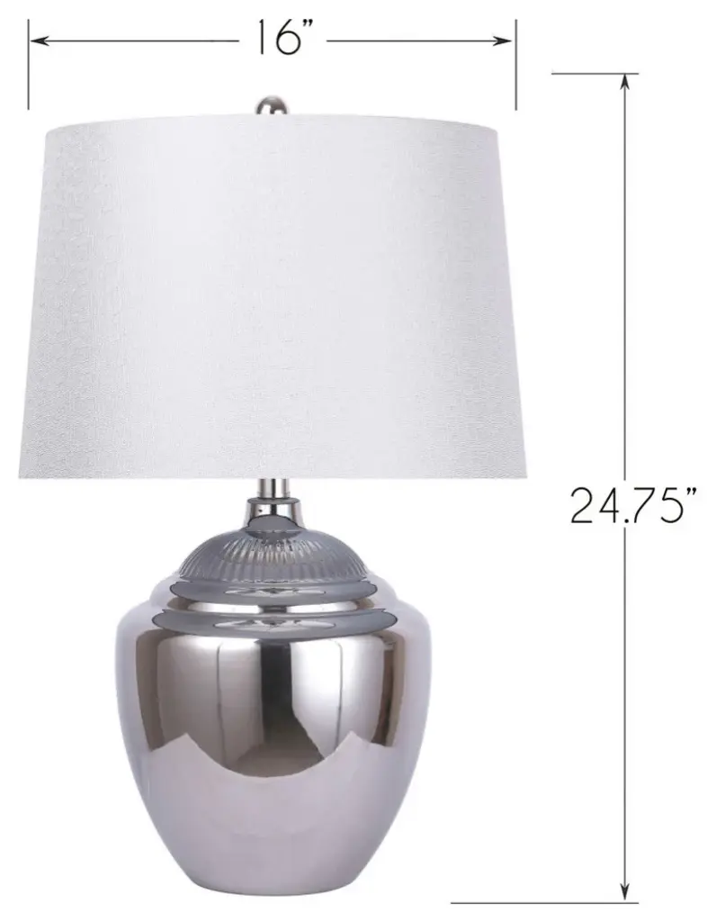 Add a bit of glamor to your home with this pair of traditional ceramic table lamps by Grandview Gallery. The urn-shaped bases feature a chrome finish on the ceramic, creating a mirror-like effect.Topped by an empire shade wrapped in white fabric with sparkly silver thread, this lamp is the perfect finishing touch to any space. Whether resting on your nightstands, positioned upon side tables, or styling up the office, these lamps are the modern, chic solution to your lighting needs.Set of two lamps, each is 24.75" tall. Round bases are 5.25" wide. Hardback tapered drum shades are 16" at their widest and are 10.5" tall.Each lamp uses one 100-watt maximum "A" bulb (not included) and features an E26 socket with a 3-way rotary switch.Grandview Gallery is a moderately priced upscale name you see on the shelves of specialty retailers, online stores and in major furniture retailers around the country. Simplicity, modern, classic, sophistication and elegance best describe Grandviews niche.
