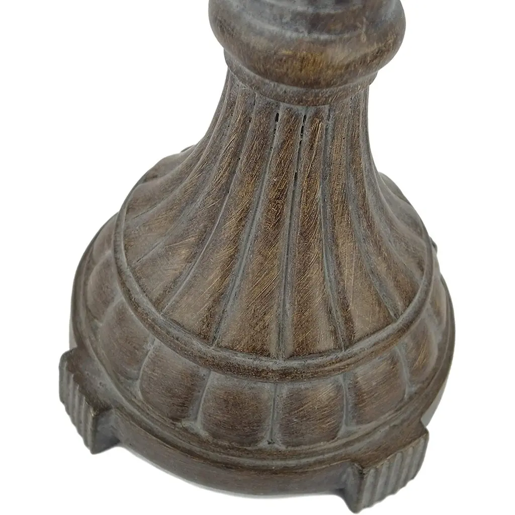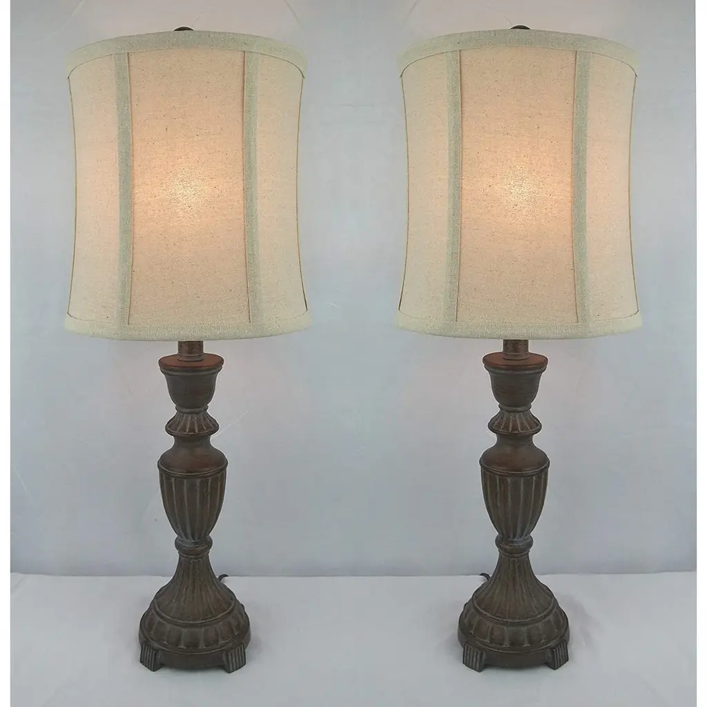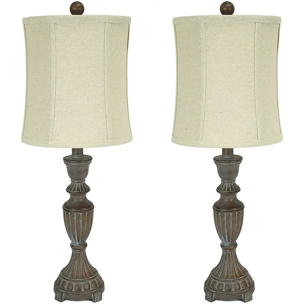Add a touch of rustic charm to your home with this set of two 25" table lamps. The whitewashed details on the gray resin bases give them a weathered and airy appearance, while the traditional turned accents complete the look. The oat-hued linen drum shades create a warm and inviting ambiance when illuminated by compatible bulbs (not included).Features: