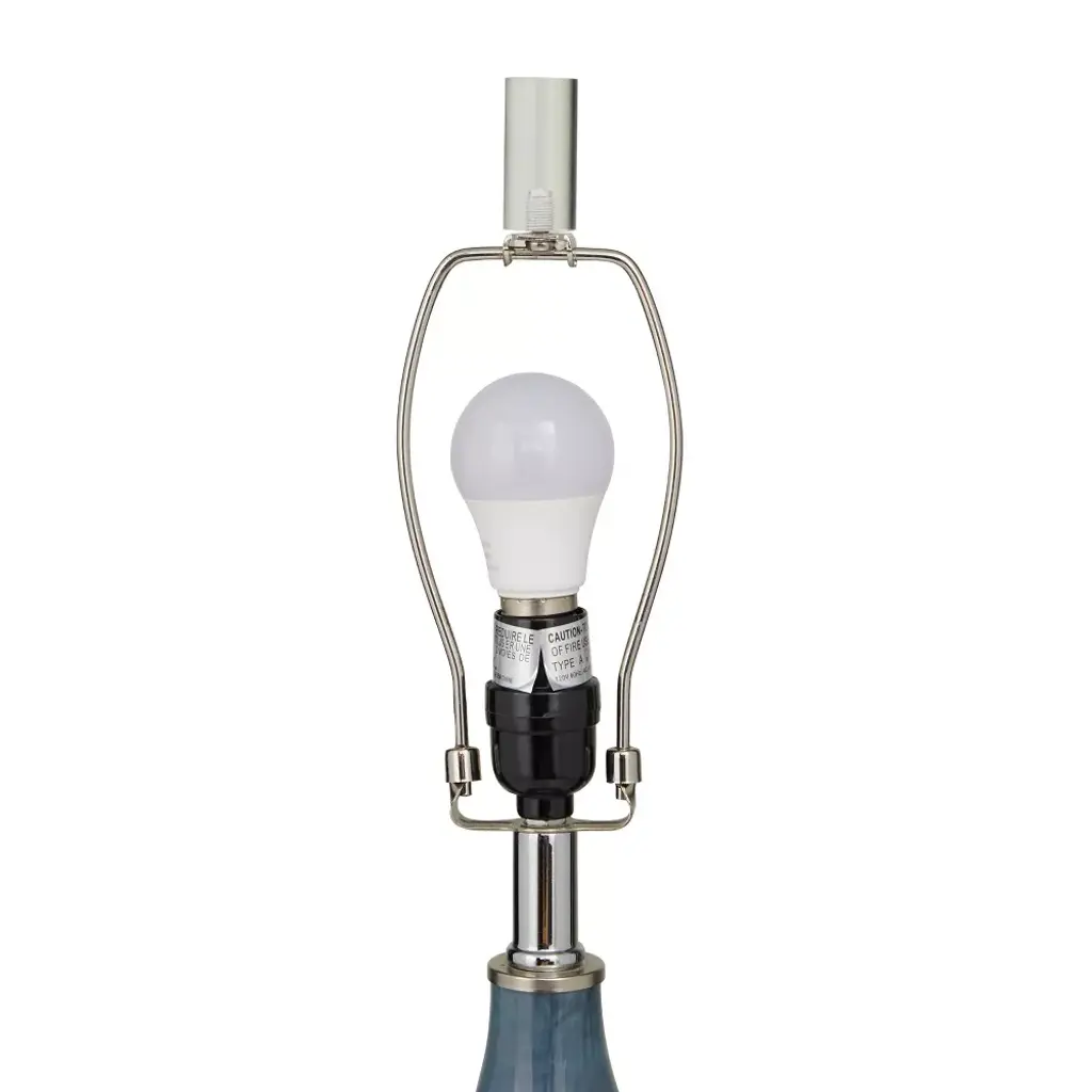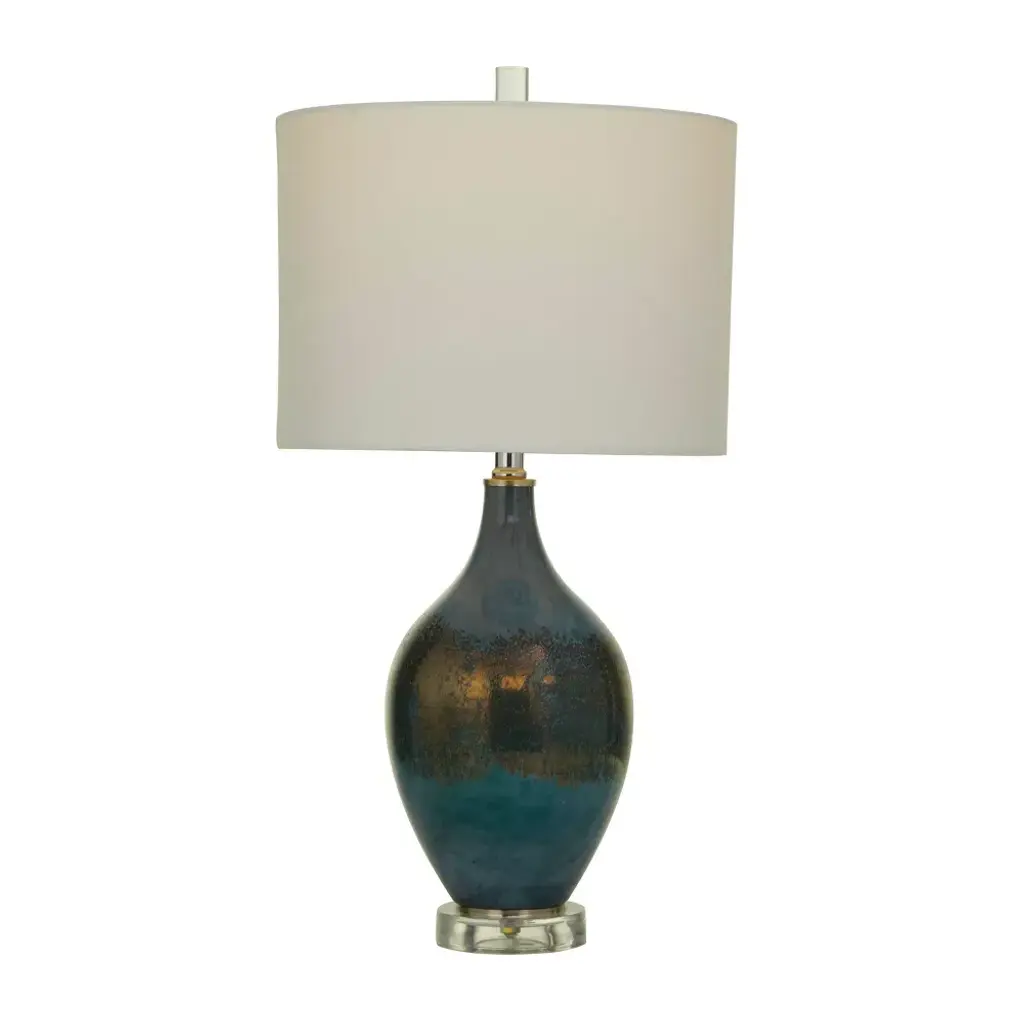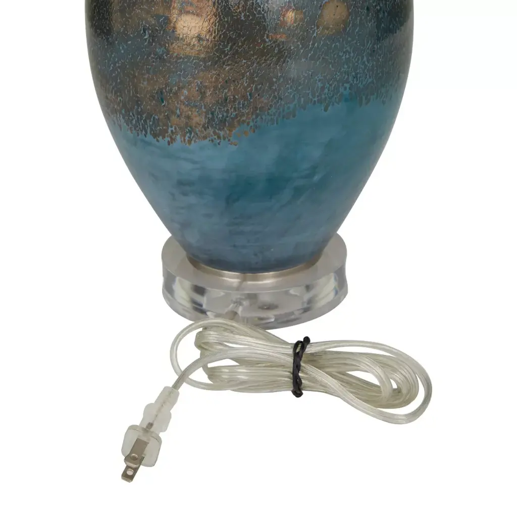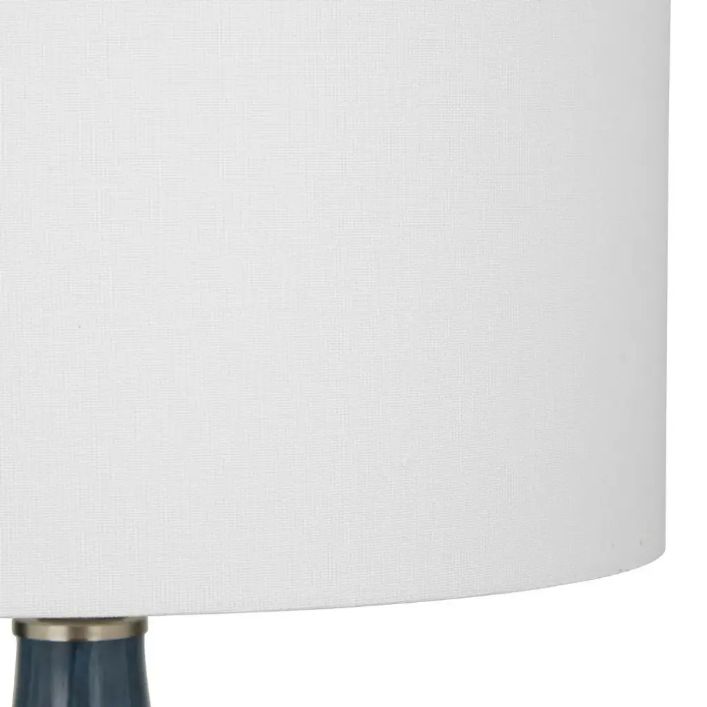 This eye catching lamp makes a charming and chic addition to your surface space and beautifully illuminate its surrounding area. Bring a finishing touch to your home with an inviting appeal with this accent table lamp. A blue curved glass accent lamp that meets your lighting needs and can give a mood booster with its warm illuminating shade. Comes with 1 socket for medium-sized E26 bulb. Bulb included. This item ships in 1 carton. Cord length measures approximately 60". Suitable for indoor use only. An accent piece featuring a white round-shaped linen shade. Comes with an on/off toggle switch. Modern Inspired.
