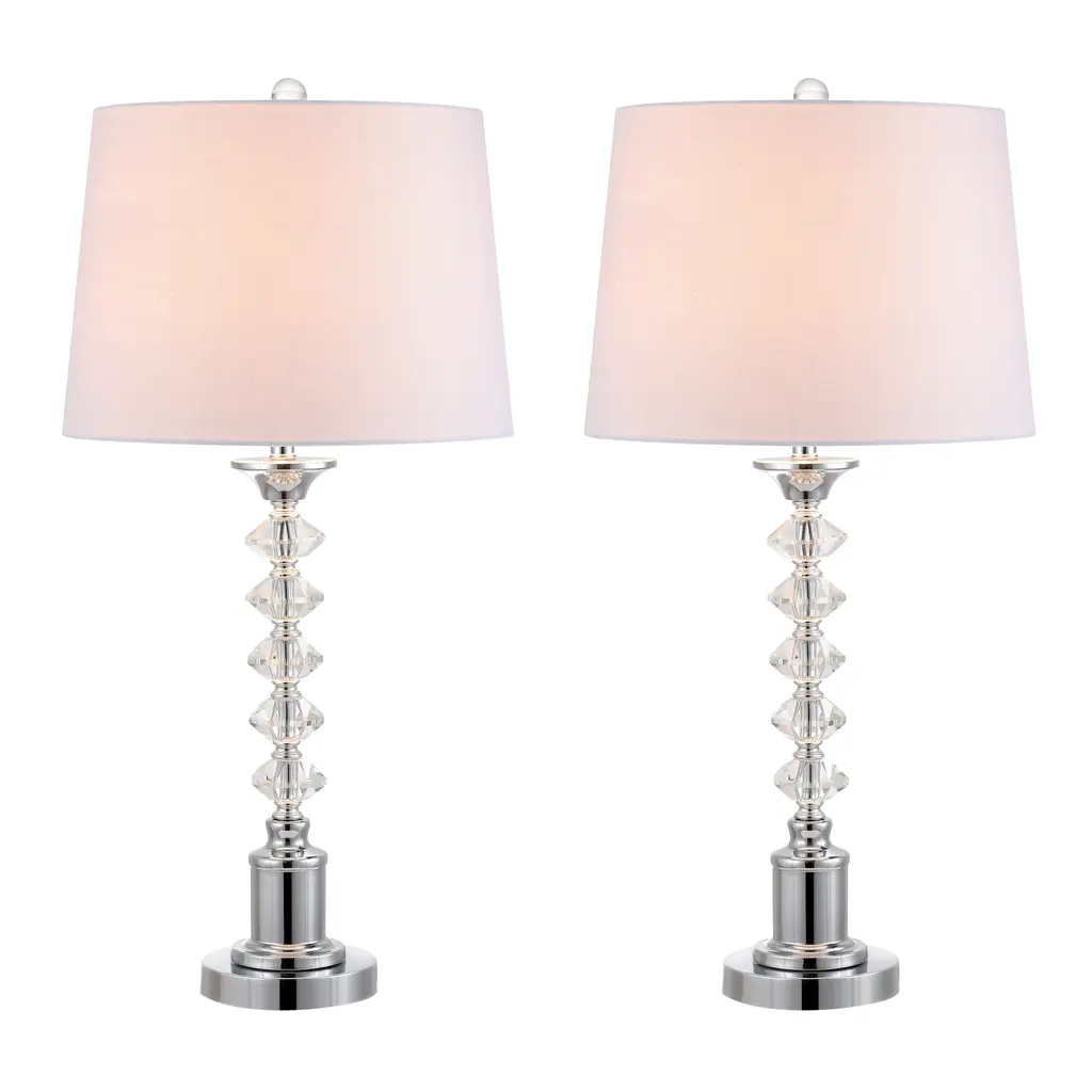 Set of 2 - 25" height crystal clear table lamp with white fabric shade. Included On/Off socket switch and 1 x 9W E26 LED light bulb (Max 60W).