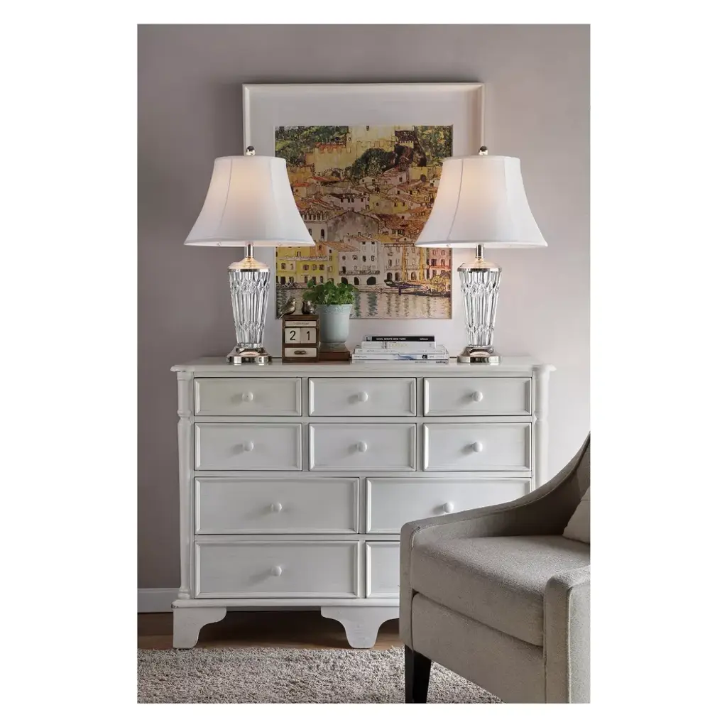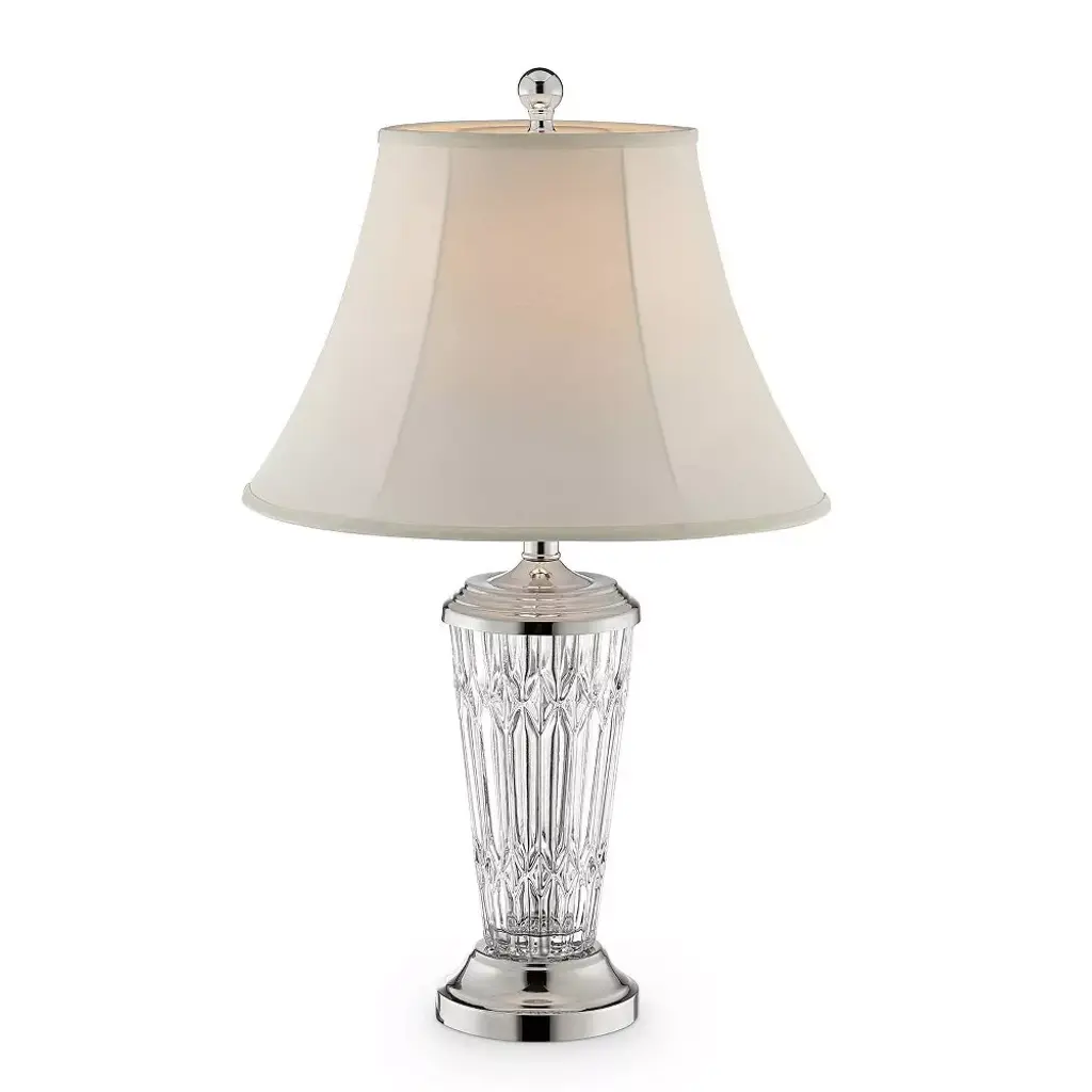 A set of two semi-fluted glass urn Portia Table Lamps with round metal bases and bell off white linen shades. Boasting elegance and modern style, this pair of transitional table lamps showcases bright clear glass as the focal point. Sleek metal bases offer an additional touch of shining appeal while matching clear chrome finials rest atop each lamp's harp. The designs are completed with clean, classic off white drum shades. Perfect addition for your bedside, sofa table or office.
