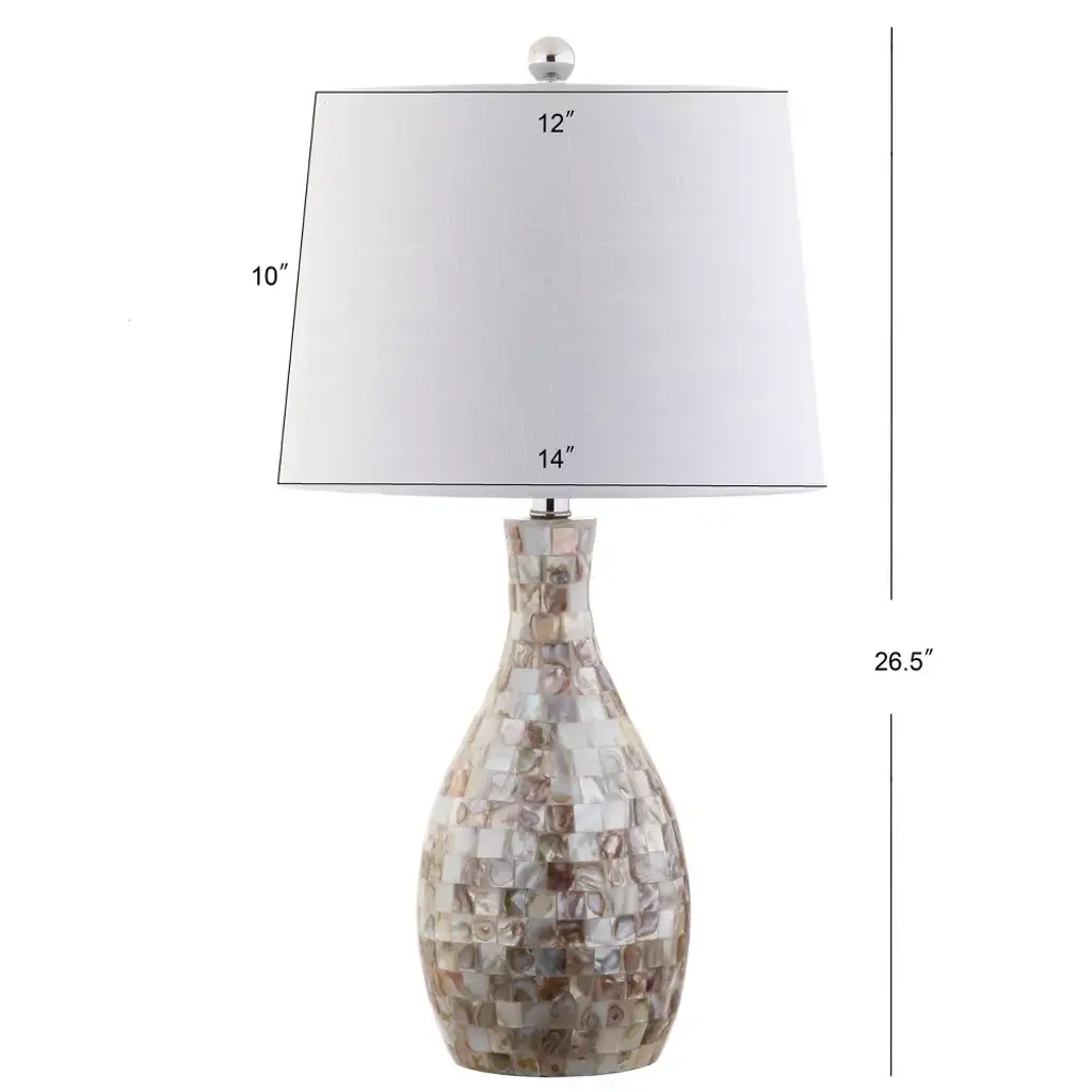 The elegantly curved base of this nearly 27" table lamp is carefully adorned with a mosaic of square capiz shell tiles and chromed accents. A white linen shade balances the look while a silk-wrapped cord provides style all the way to the plug. You'll love how the shells reflect the warm glow of the bulb when illuminated and their many shades of natural beauty from ivory to bronze.