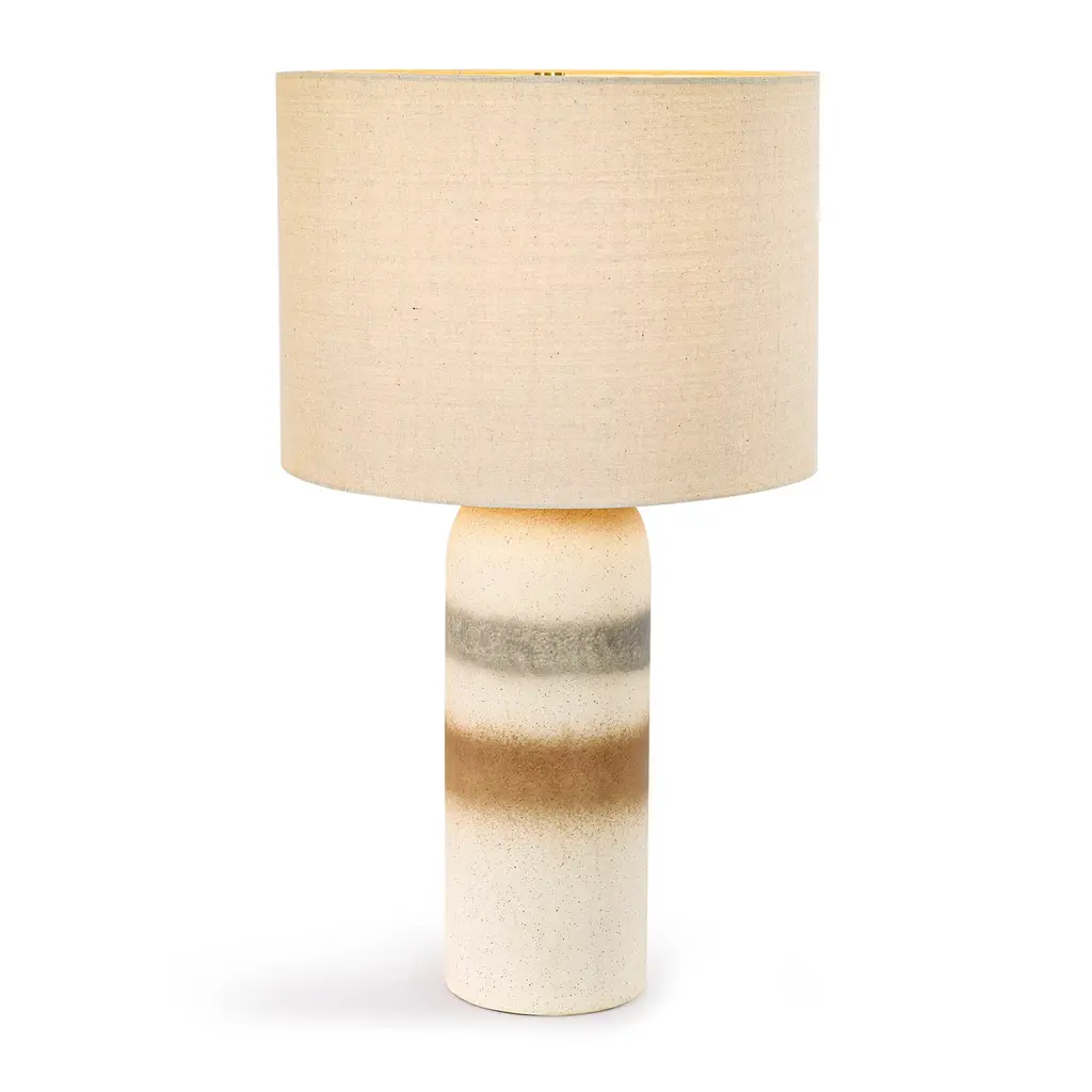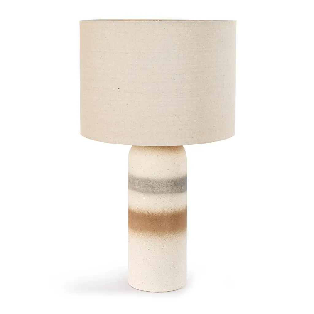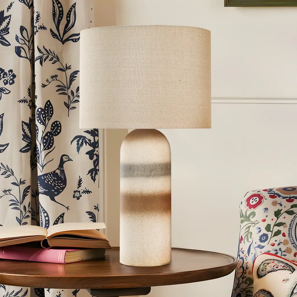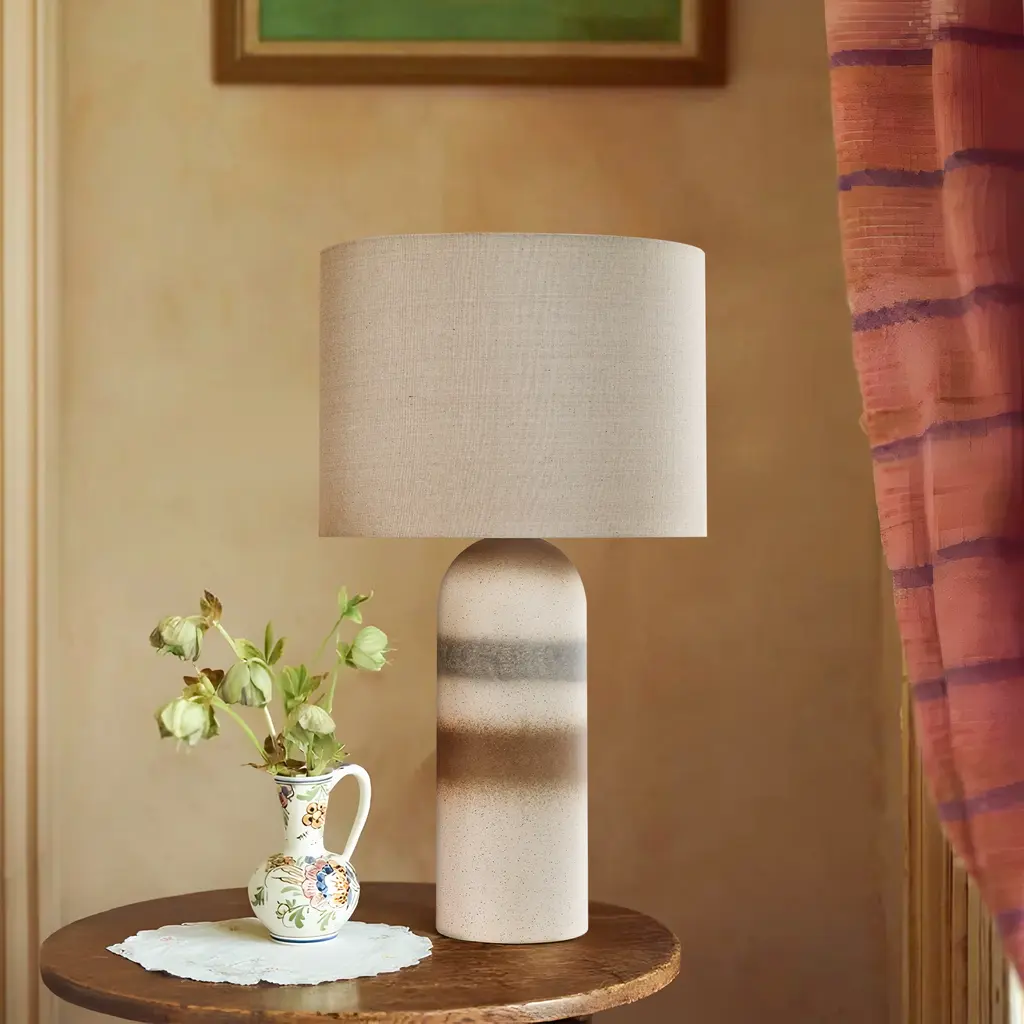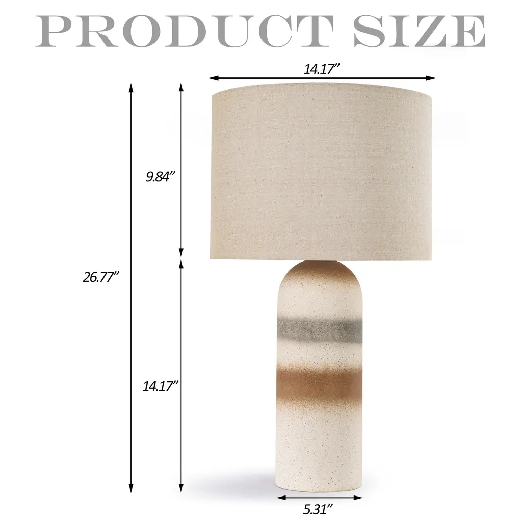 This stylish table lamp adds a contemporary touch to your home with its unique ceramic base and soft linen lampshade. The drum-shaped lampshade in a light beige color diffuses light beautifully, creating a warm and soft glow. The ceramic base features a textured surface with three irregular spray rings, adding visual interest and durability. Equipped with a dimmable switch, you can adjust brightness to create the perfect lighting for your space. Simple to assemble, this lamp brings both elegance and practicality to your home. (light bulb sold separately.) Feature: