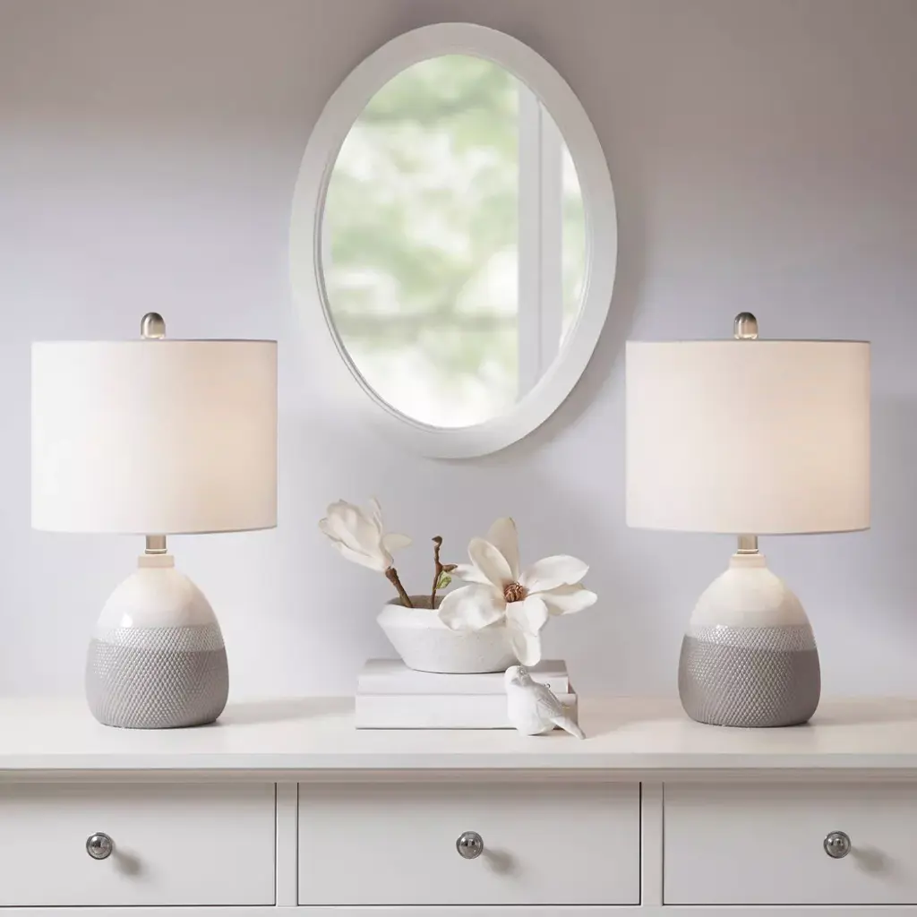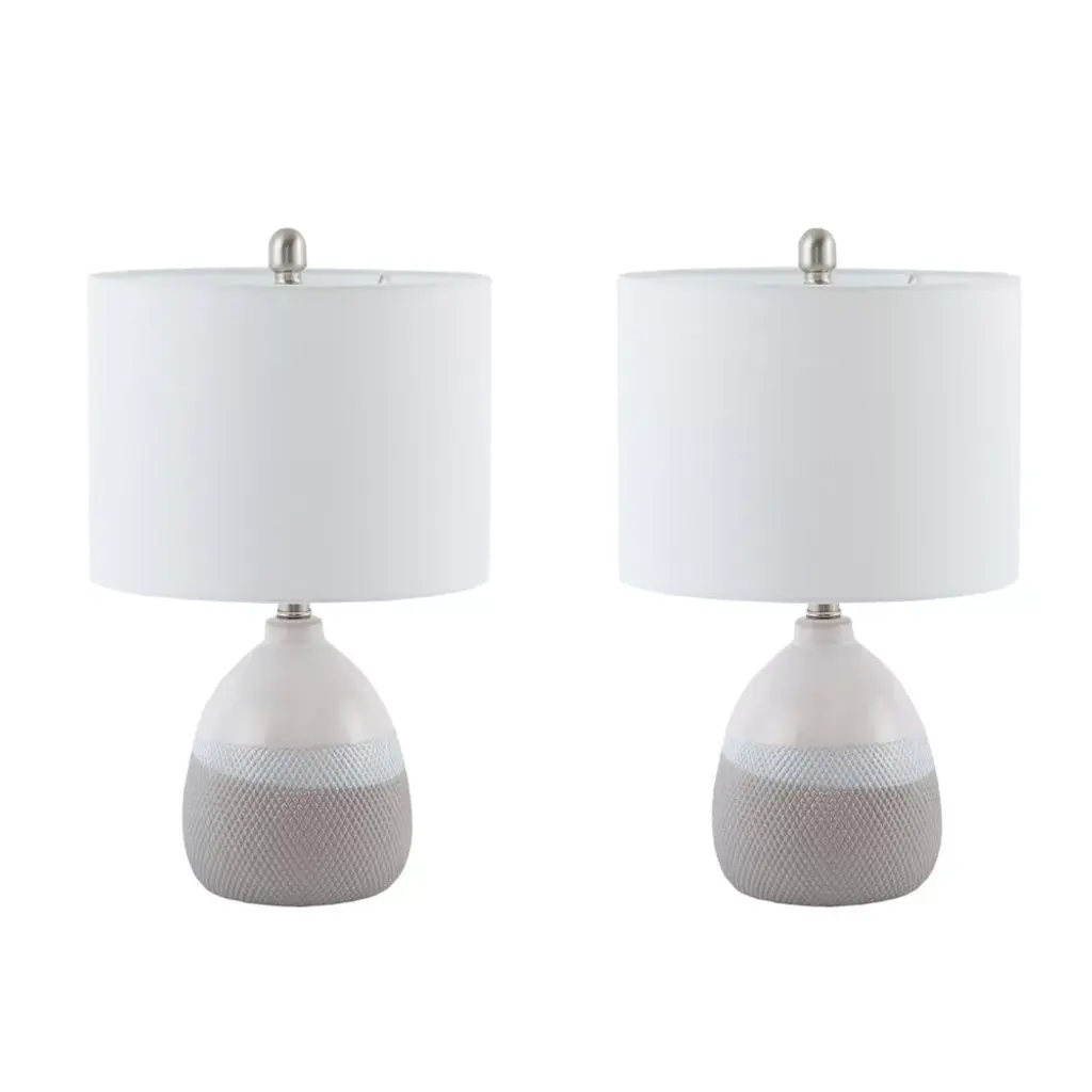 Update your space with the sleek style of the 510 Design Driggs Ceramic Textured Table Lamp. The base is made from ceramic with a painted Ivory/Gray and white finish for a sleek gradient look. The drum shaped white shade softly filters the light, while also beautifully complementing the striking look. This table lamp is easy to incorporate into your existing space and perfect for accenting any living room or bedroom. One Type A light bulb is needed and included. Comes with a 2-year warranty.