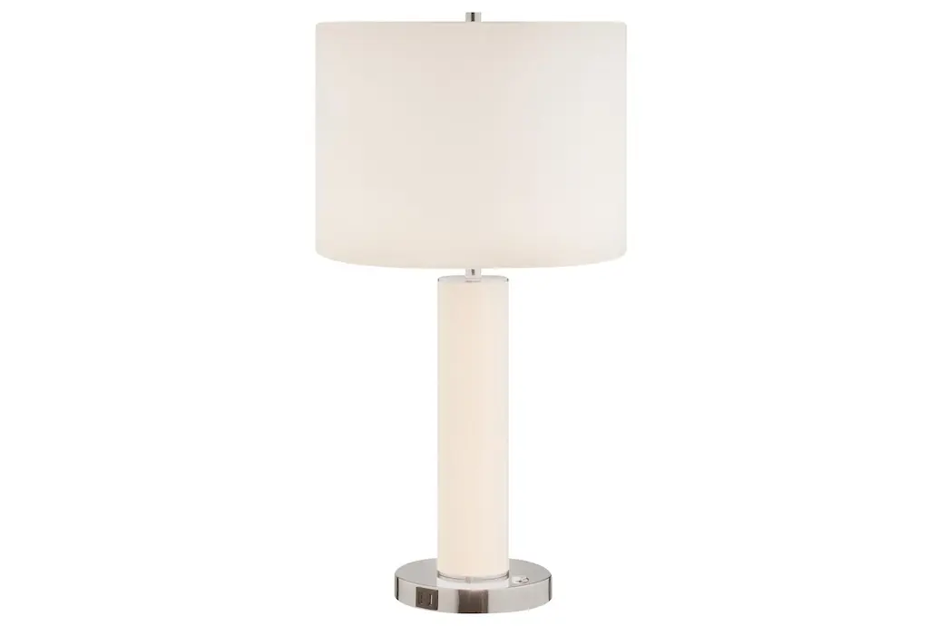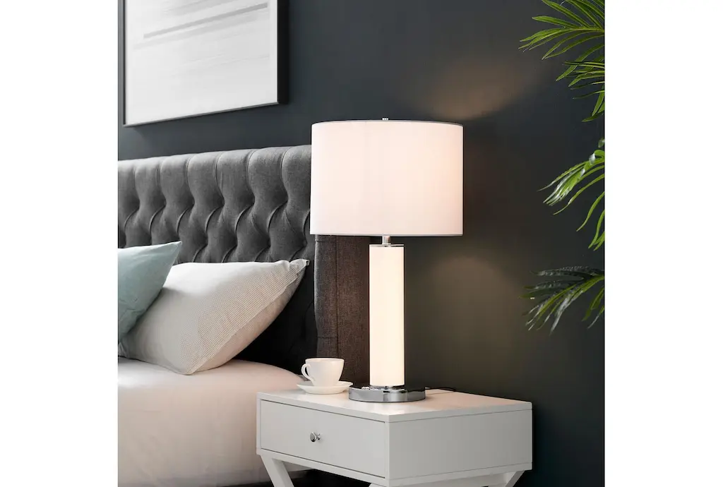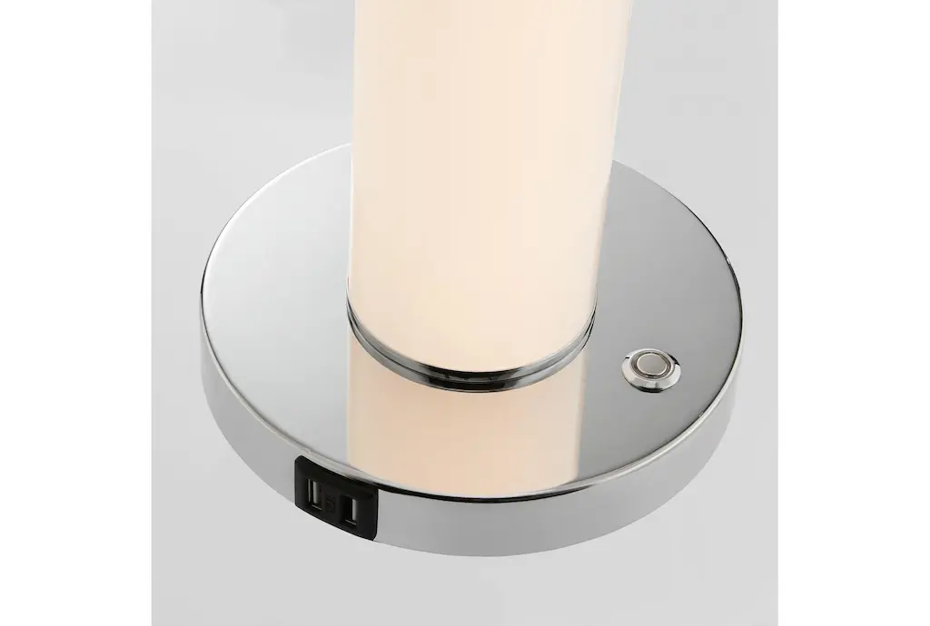 This modern bedside table lamp features a frosted glass cylinder shade and sleek silver chrome base. Experience a subtle glow with the glowing night light feature, while the metal and glass materials create a stylish and contemporary look.