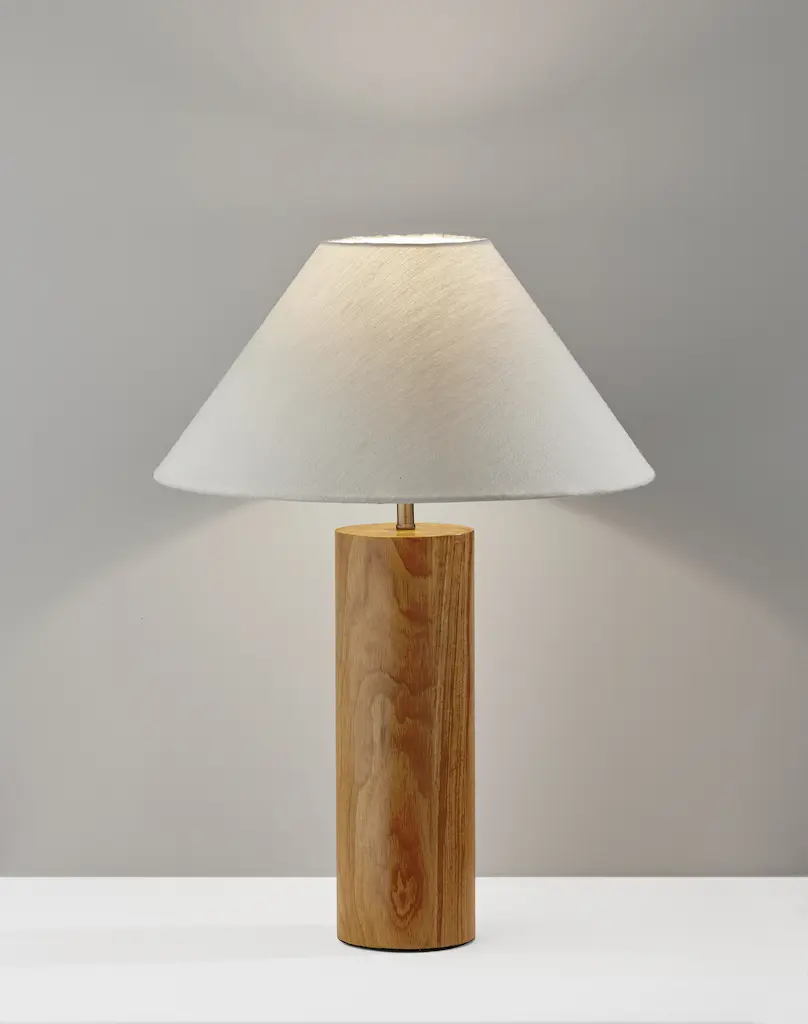 Illuminate your space with the 26 Inch Natural Wood Cylinder Table Lamp with Ivory Shade. This modern table lamp blends seamlessly into any bedroom or living room, adding a touch of natural charm with its natural oak wood and antique brass accent. The curved, triangular shade softens the light, creating a warm and inviting atmosphere.