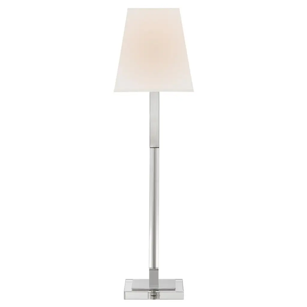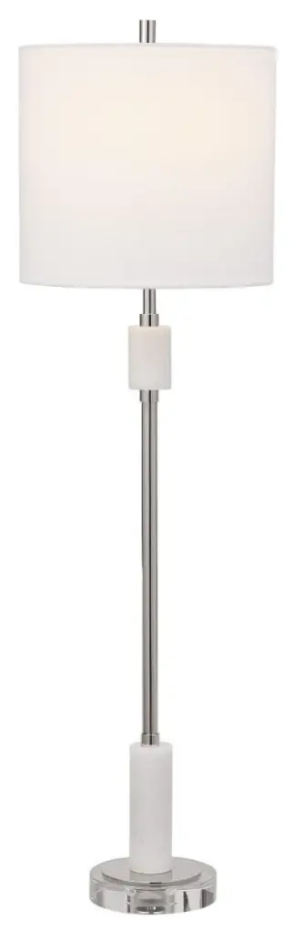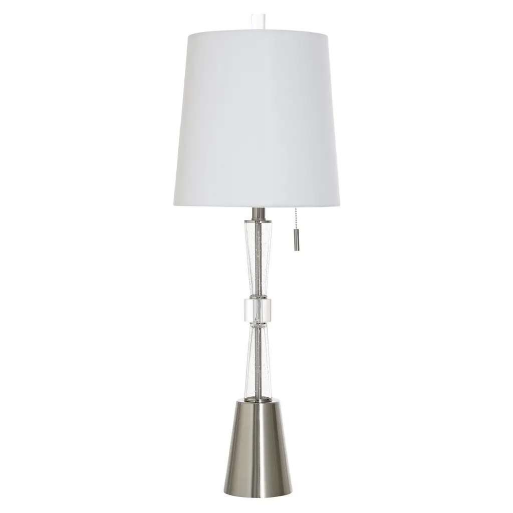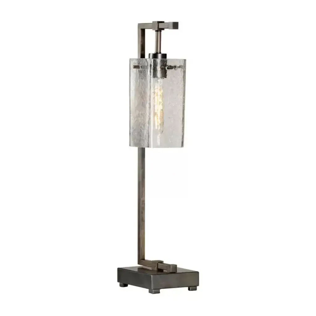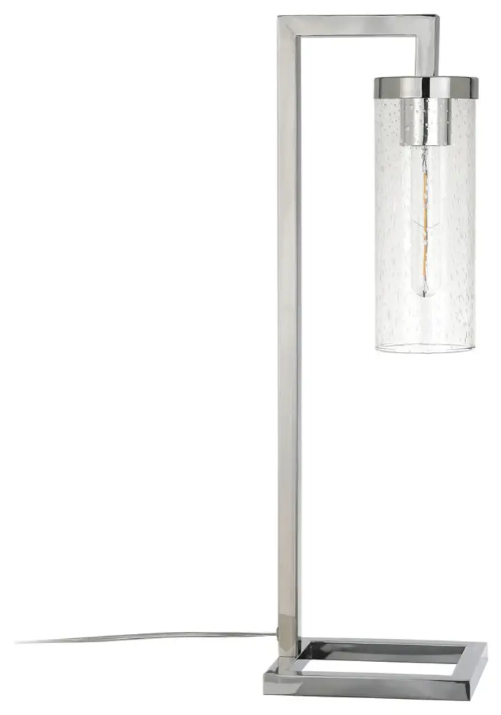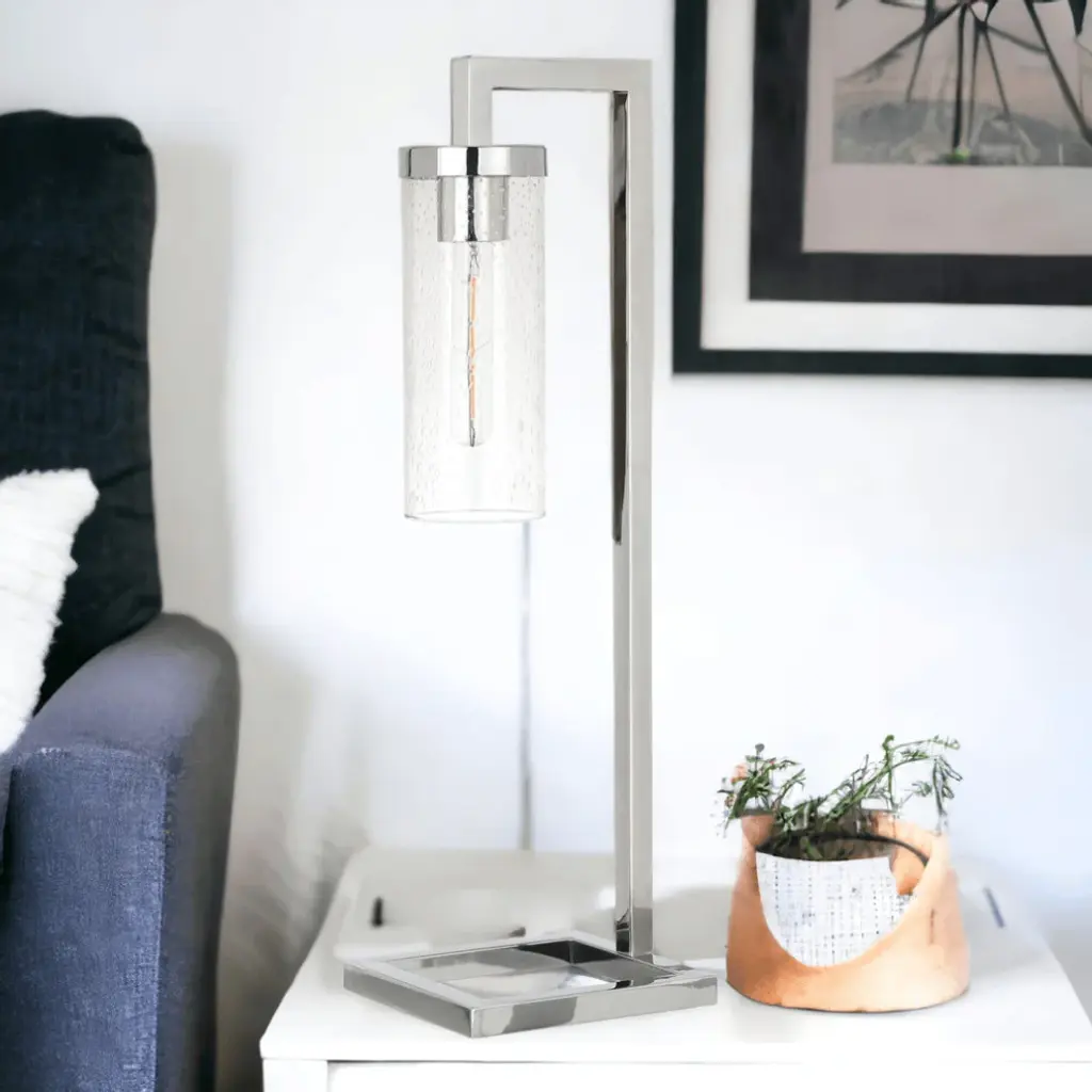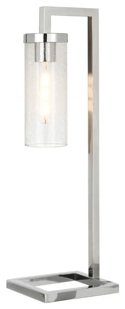 Truly a mix of design and functionality that doesn''t compromise on style, this 26-inch nickel metal arched table lamp with clear seeded cylinder shade will be a great addition to your space. The lamp is made of sturdy metal and features a nickel color. Includes a clear glass, cylinder shaped shade, making this a fashionable piece that will complement most any interior. A sophisticated take on a classic, this arched table lamp is a great option for a unique look. Use this lamp anywhere and elevate the look of the whole space. The perfect lamp to create just the right natural and soothing light in your space. 26-inch H x 8-inch W x 7-inch D