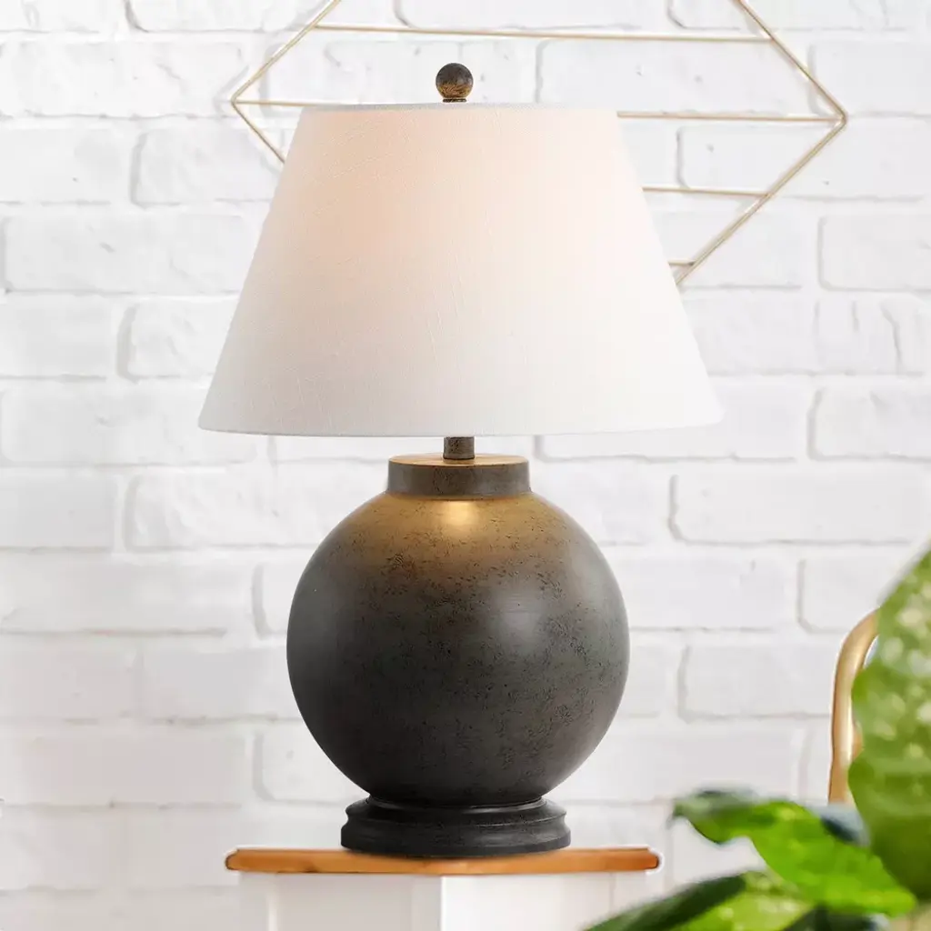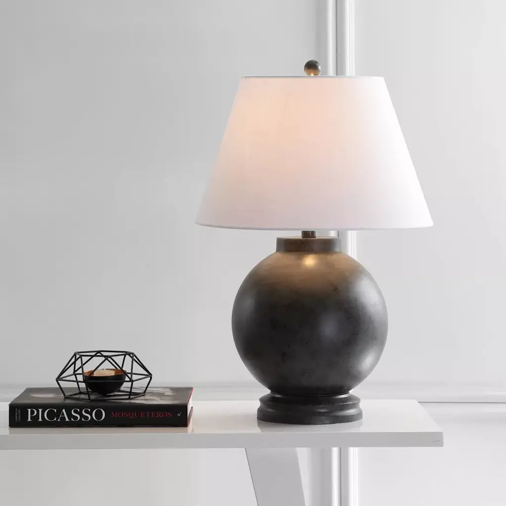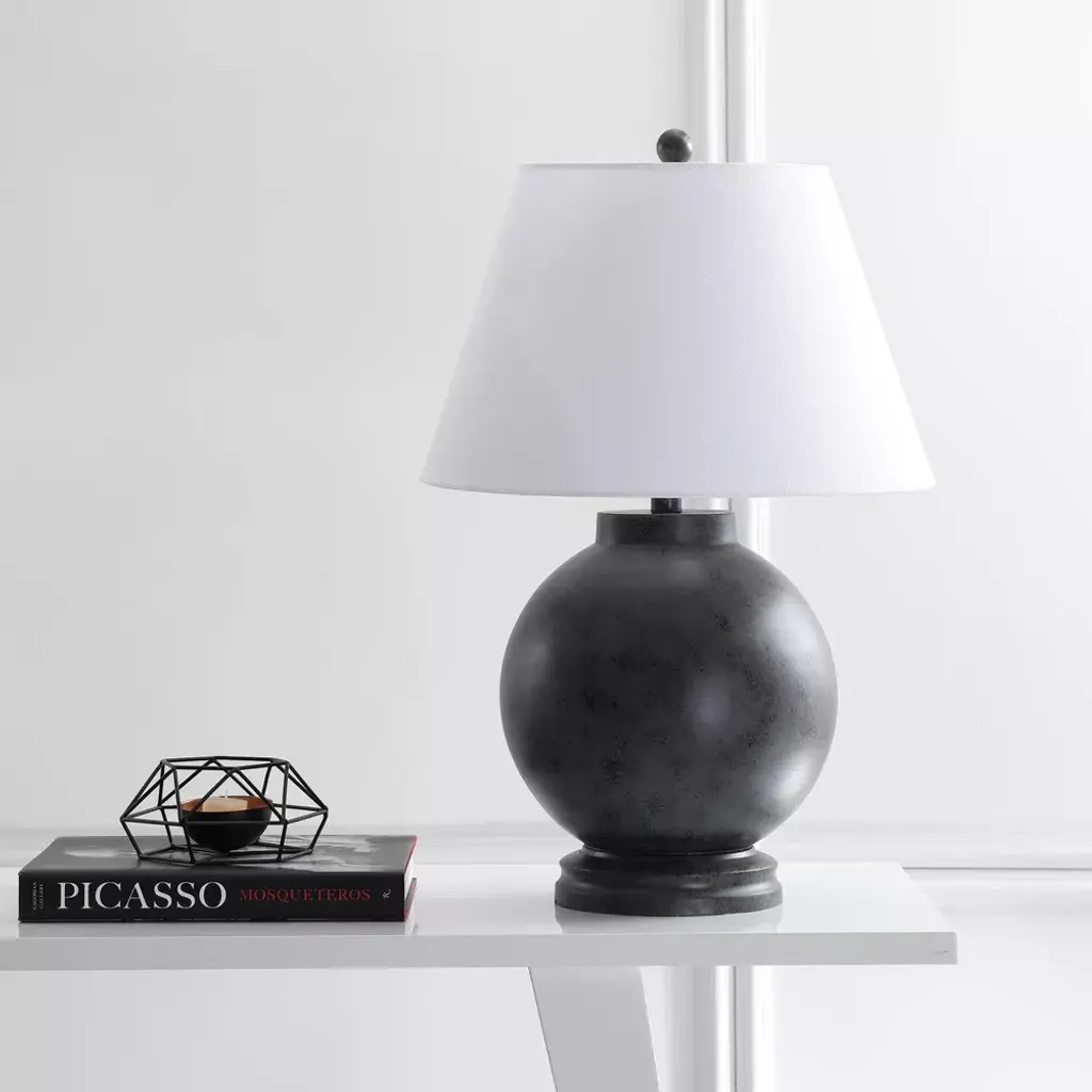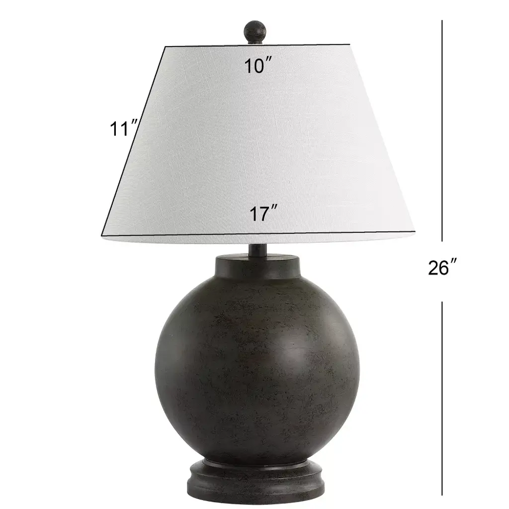 This sphere-shaped lamp base is both cheerful and sculptural in a Dark Gray glaze -- the perfect statement piece on desks or consoles. The finish extends to the finial and base for a clean and streamlined look. Crafted in resin and topped with a white cotton empire shade. A classic sphere base is made modern in a dark-gray shade and stepped pediment. 100% cotton hardback drum shade. Beautiful to display or easy to conceal: the 60 cord is silk-wrapped. On-off rotary switch on socket. Eco-friendly 9W LED bulb included. Takes one bulb and compatible with any 12W LED or 100W Type A or 23W CFL. UL Listed. Before cleaning any lamp shade or fixture, disconnect the power source. Wipe with a soft, dry cloth. Avoid the use of chemicals and household cleaners as they may damage the finish.