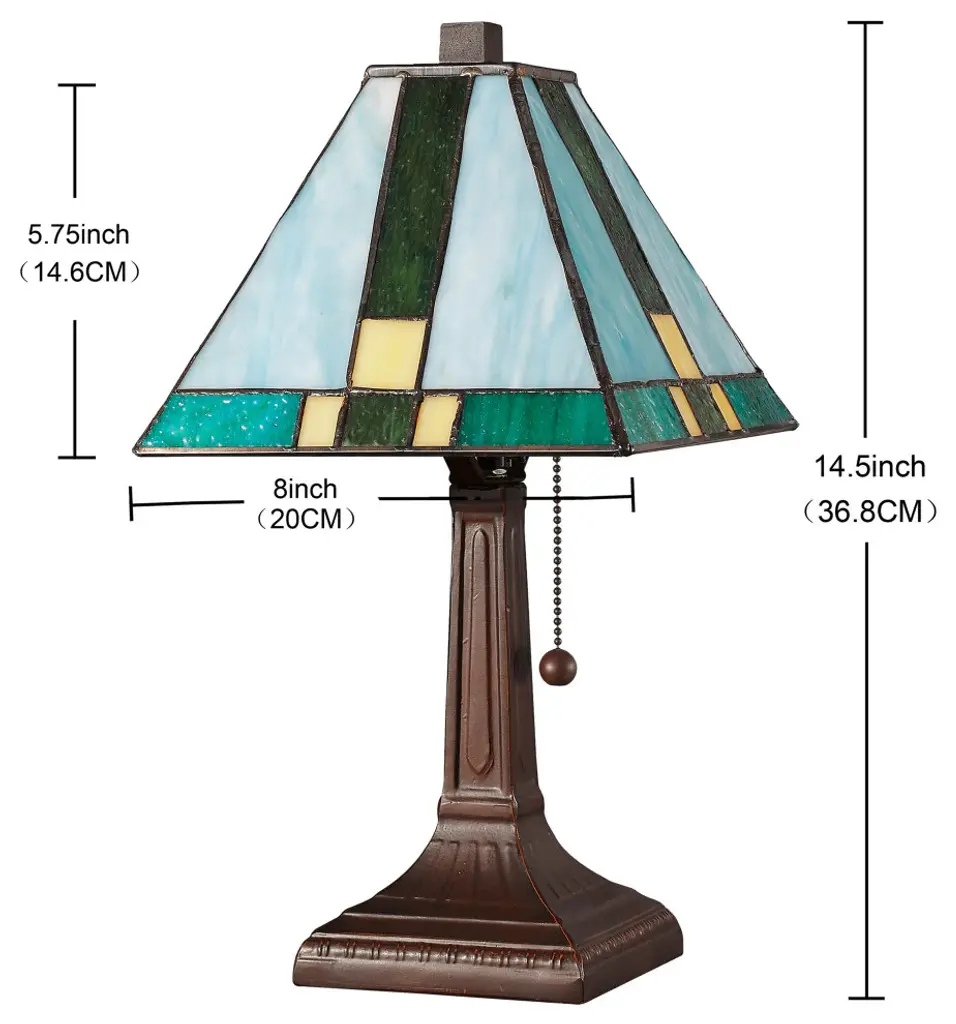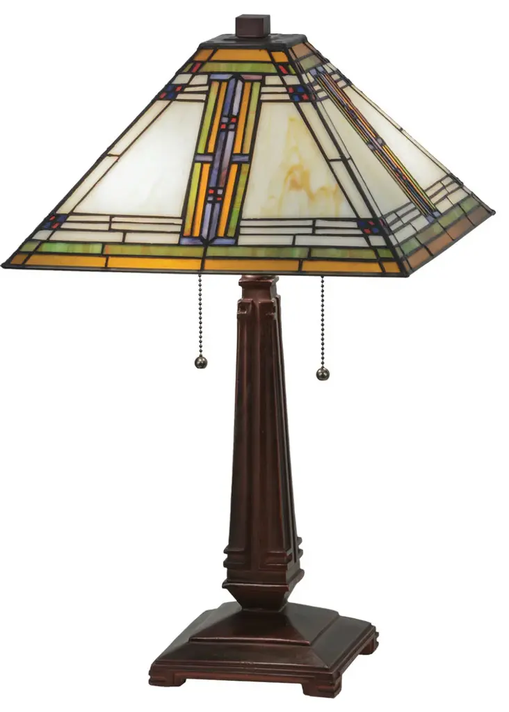 This stunning Mission style lamp features a geometric pyramid-shaped shade with "Cats Paw" art glass, featuring Gray, Blue, Green and Purple art glass, with Sky Blue accents around Amber cast glass jewels. Purple and Green glass chevrons highlight the design, which is trimmed with Amber glass. The shade was created with authentic stained glass using Meyda Tiffany s famous copper foil construction process and is complemented with a base finished in Mahogany Bronze. UL Approved: YesHardwire or Plug: PlugBulb Quantity: 2Bulb Type: MEDBulb Wattage: 60Bulbs Included: No