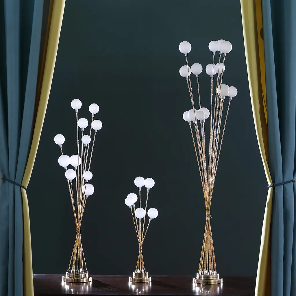 Add sculptural style with soft ambient lighting to your living room or bedroom with this white 6-Light frosted orbs table lamp. Featuring 1 large, 4 medium and 1 small white frosted acrylic orbs staggered along an aluminum hourglass shape tasseled together yellow gold/silver stem, this light is full of contemporary and modern style. The Chrome metal round base is solid and sturdy, adding sophisticated style. Introduce a stunning conversation starter into your home with this Chrysanthe Orb LED table lamp. Standing a majestic 27.5 inches high, this lamp boasts 6 globes or orbs position in different heights on a sleek aluminum tighten together to form a contemporary design that draws attention. Will bring you a romantic ambience, putting you in a better mood from relaxed to energetic to romantic. The in-line On/Off switch at the black cord give easy access in the dark, allowing this lamp to take center stage with a diffused floating light effect. Its slender design allows it to position well near seats, sofas, side tables, etc. Warm lights can bring you a sweet night, cool white lights can help you focus and allows you to get the most comfortable brightness for your space. Works in your bedroom as night light bedside lamp, any living spaces as mood lighting or anywhere else in your house.