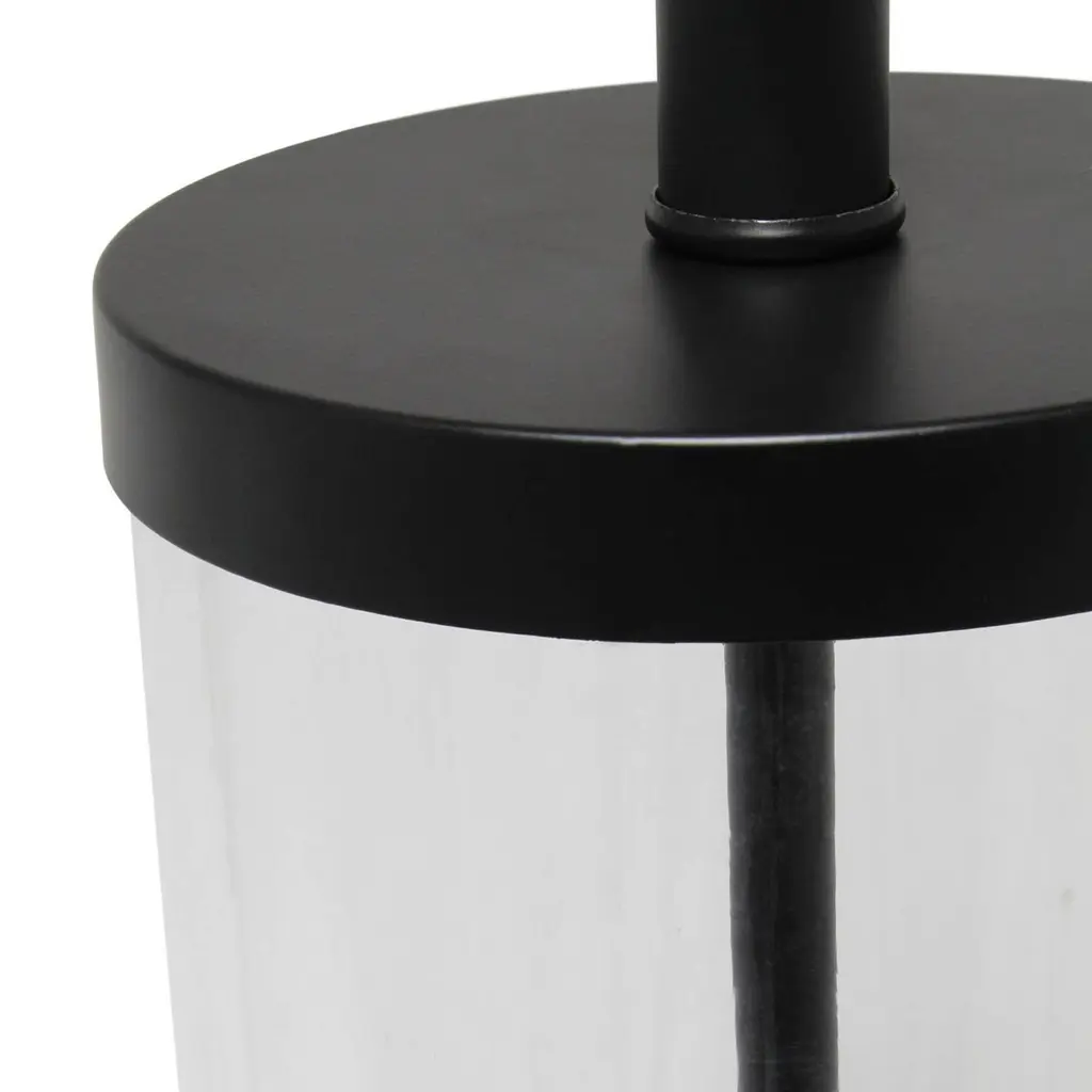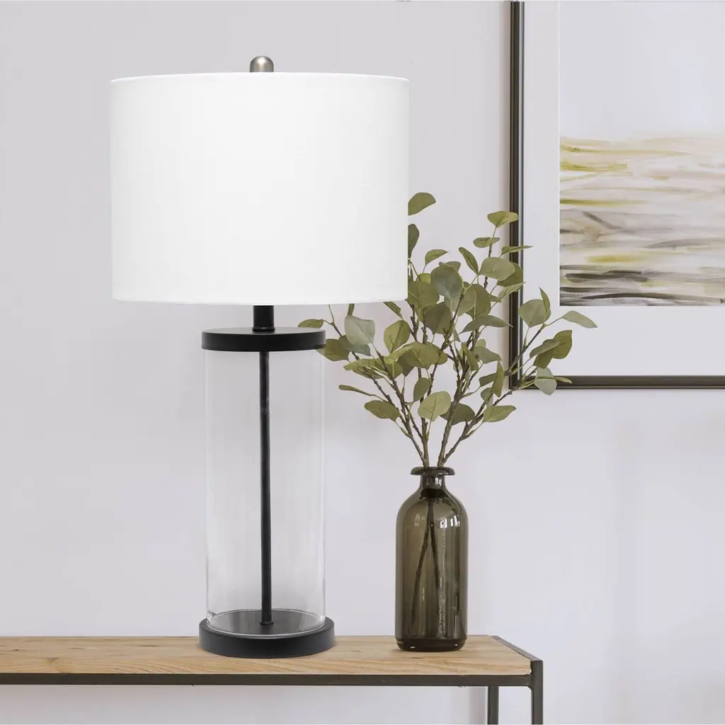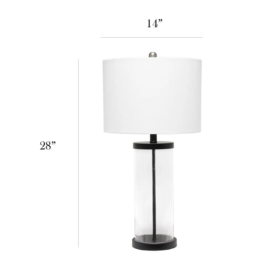 This simple, yet sophisticated table lamp showcases a crystal-clear glass column paired with black metal accents and a white fabric drum shade for a clean, elegant look. Illuminate any room in your home with style. Perfect for living room, bedroom, office, or anywhere you need to add a touch of sophistication!Features: