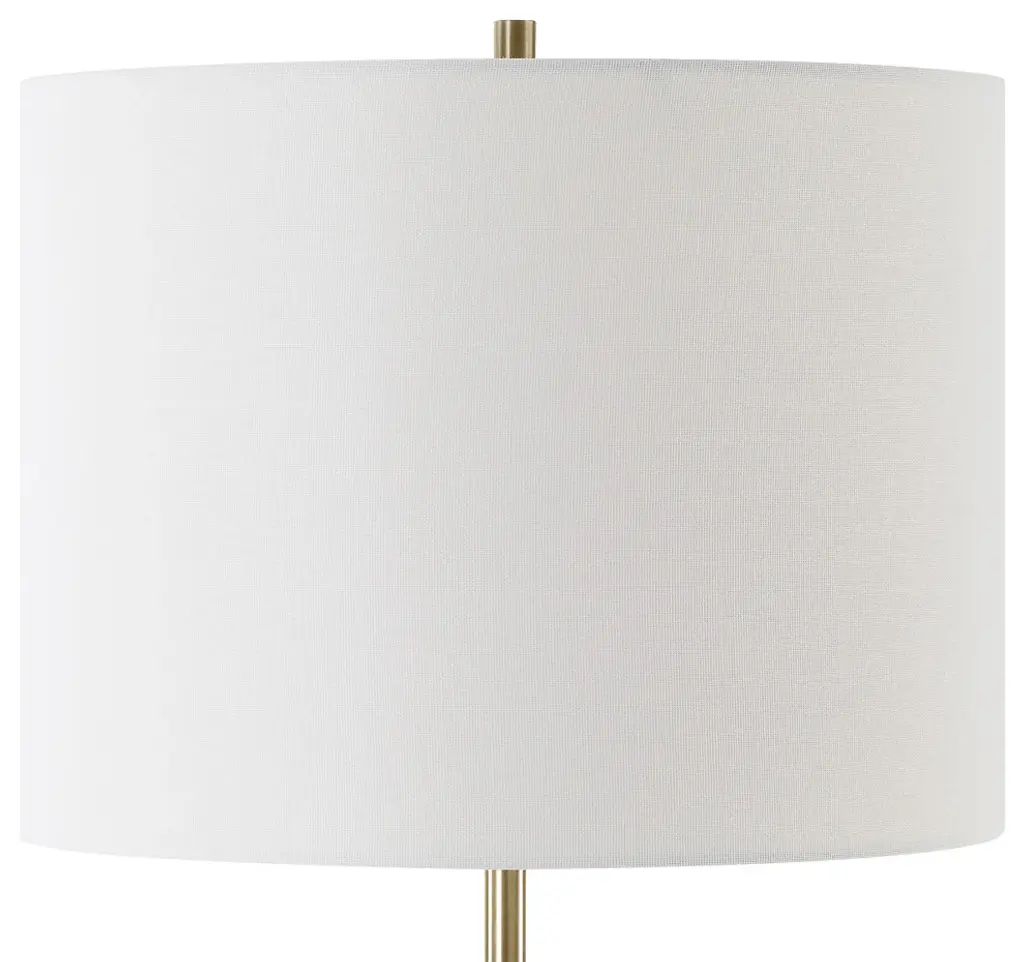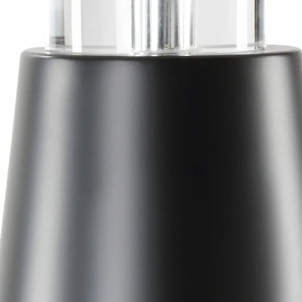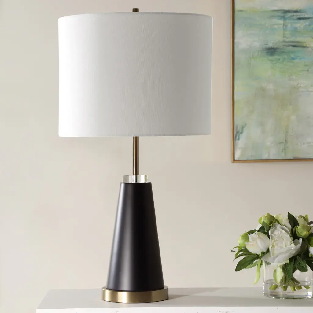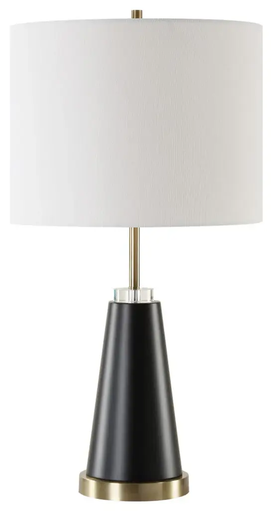Elevate your space with this modern silhouette that will complement any interior style. Designed with a sleek tapered metal body, the striking black finish and antique brass accents are enhanced with a crystal element, adding to the visual appeal. A round