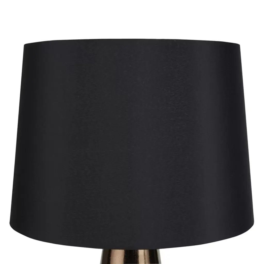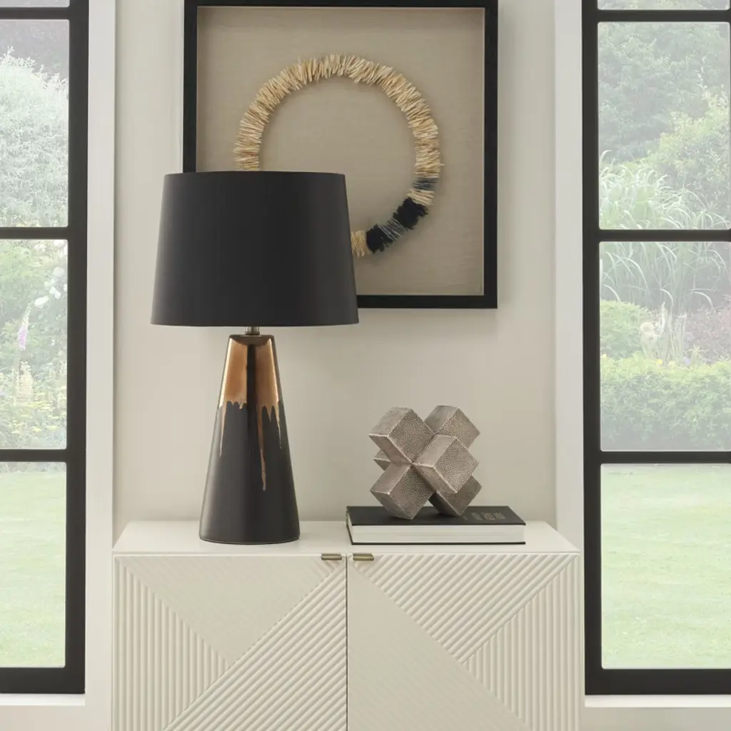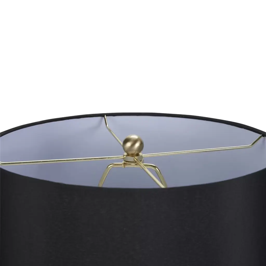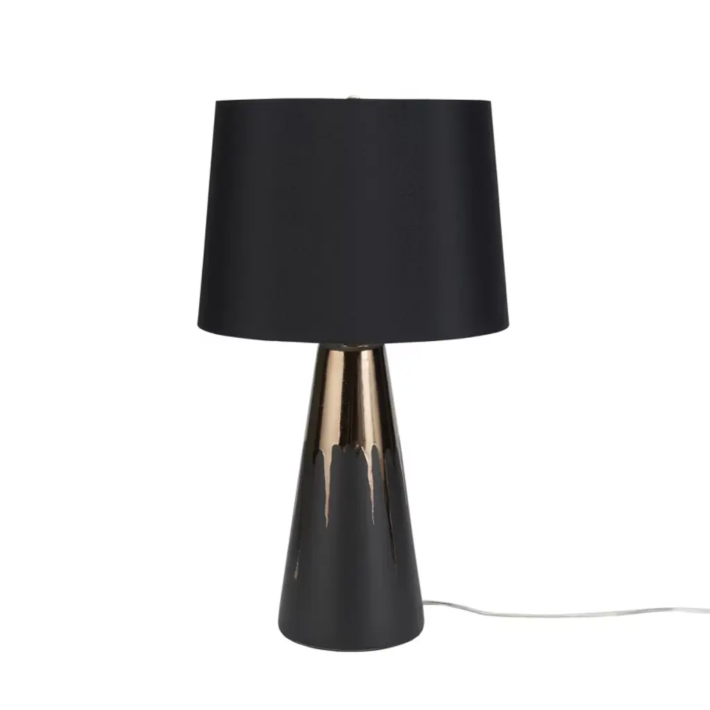 This chic ceramic table lamp boasts a smooth black base adorned with gold paint details, seamlessly blending elegance with a touch of artistry. Topped with a dark, black shade, it casts a moody ambiance, making it a statement piece perfect for sophisticated interiors desiring a hint of drama.