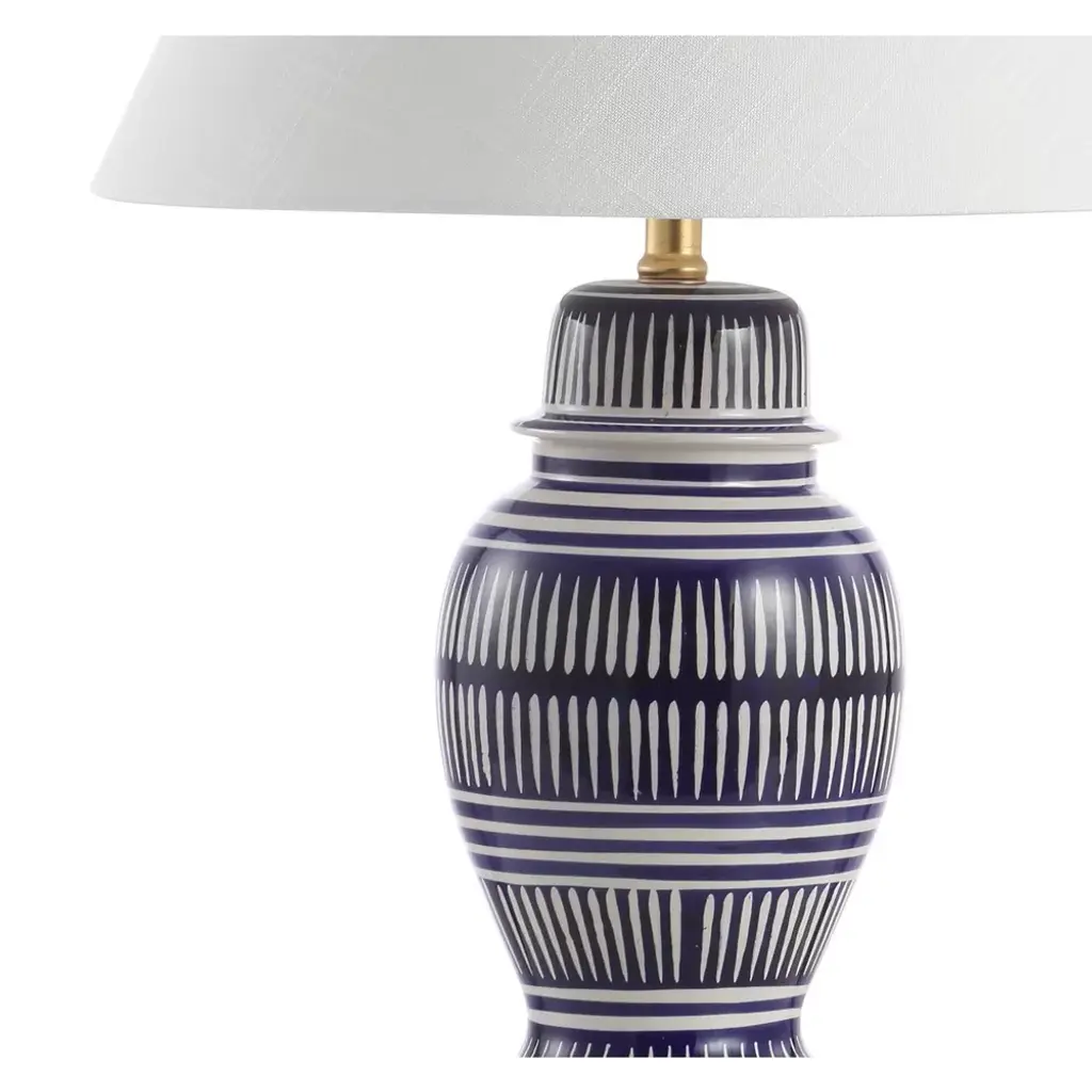 Your favorite blue and white coastal lamp gets a modern update, with its graphic white pattern on a navy background. Gold fittings and a white linen shade are a nod to the traditional ginger jar design. Add a pair to your resort condo, cottage, beach house, or nautical themed bedroom. Includes an energy-saving LED bulb.