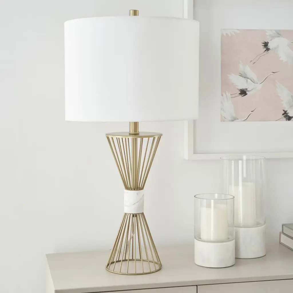 Up the elegance factor on your buffet table or console with this luxe table lamp. Drawing inspiration from vintage Hollywood glam, it features a cinched metal silhouette in gold with a marbled center band. This contemporary lamp is topped with a standard drum shade that casts a bright light into your space.