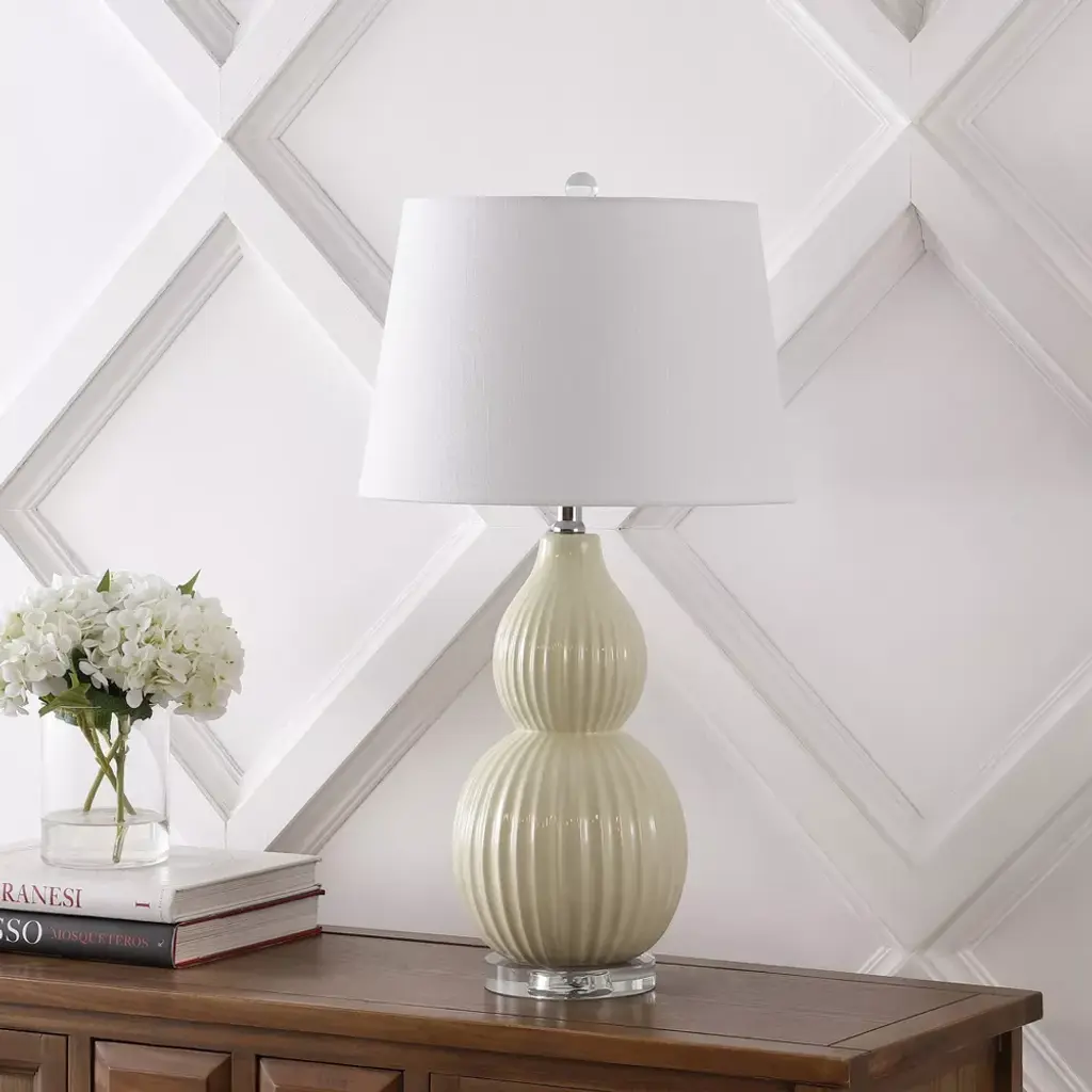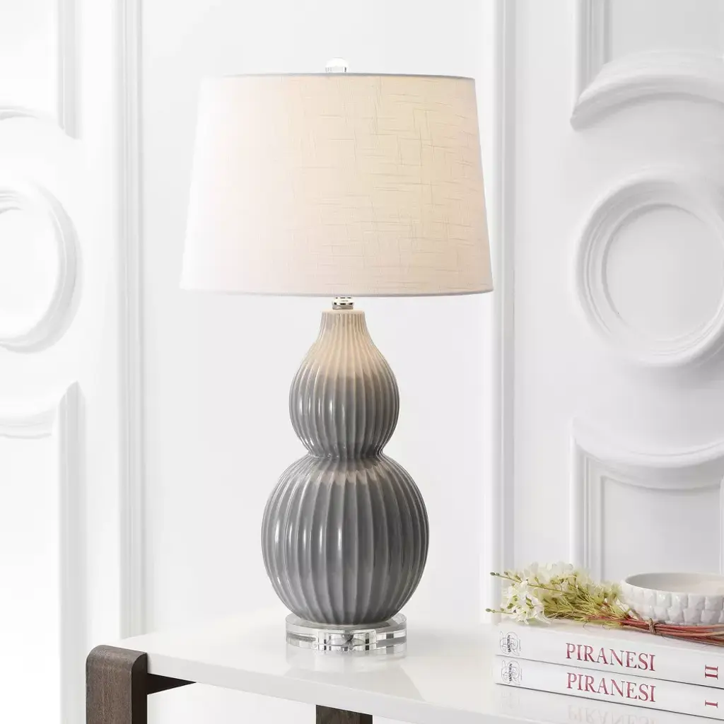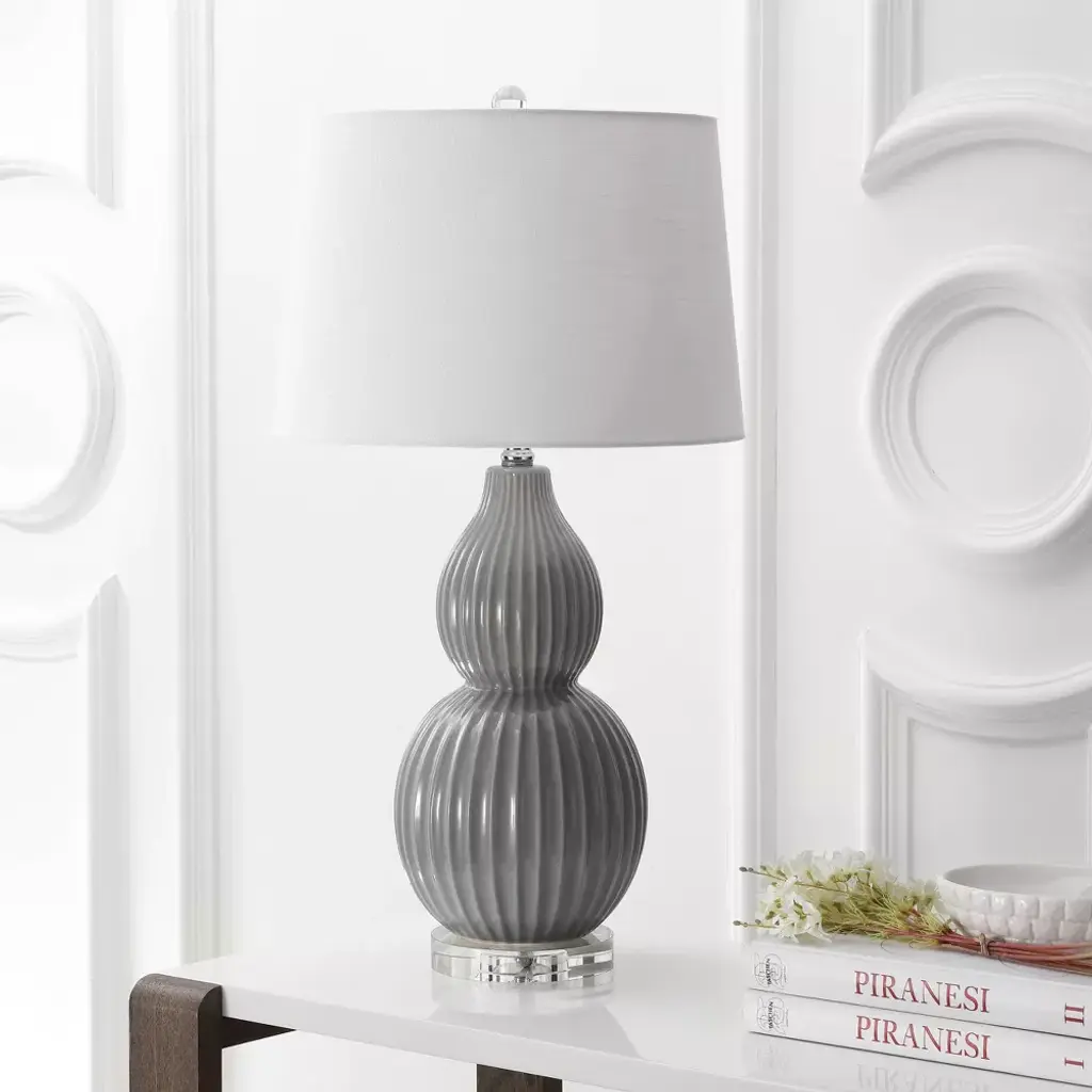 The classic double gourd lamp gets an elegant update with the addition of narrow fluting on this beautiful base. Beautifully made from ceramic, glossy gray glaze adds a serene a touch to your favorite hideaway. A classic, white cotton drum shade adds an elegant finishing touch. A classic double gourd lamp with a narrow fluting detail. 100% cotton hardback drum shade. Beautiful to display or easy to conceal: the 60 cord is silk-wrapped. On-off rotary switch on socket. Takes one bulb and compatible with any 12W LED or 100W incandescent or 23W CFL. Eco-friendly 9W LED bulb included. UL Listed. Before cleaning any lamp shade or fixture, disconnect the power source. Wipe with a soft, dry cloth. Avoid the use of chemicals and household cleaners as they may damage the finish.