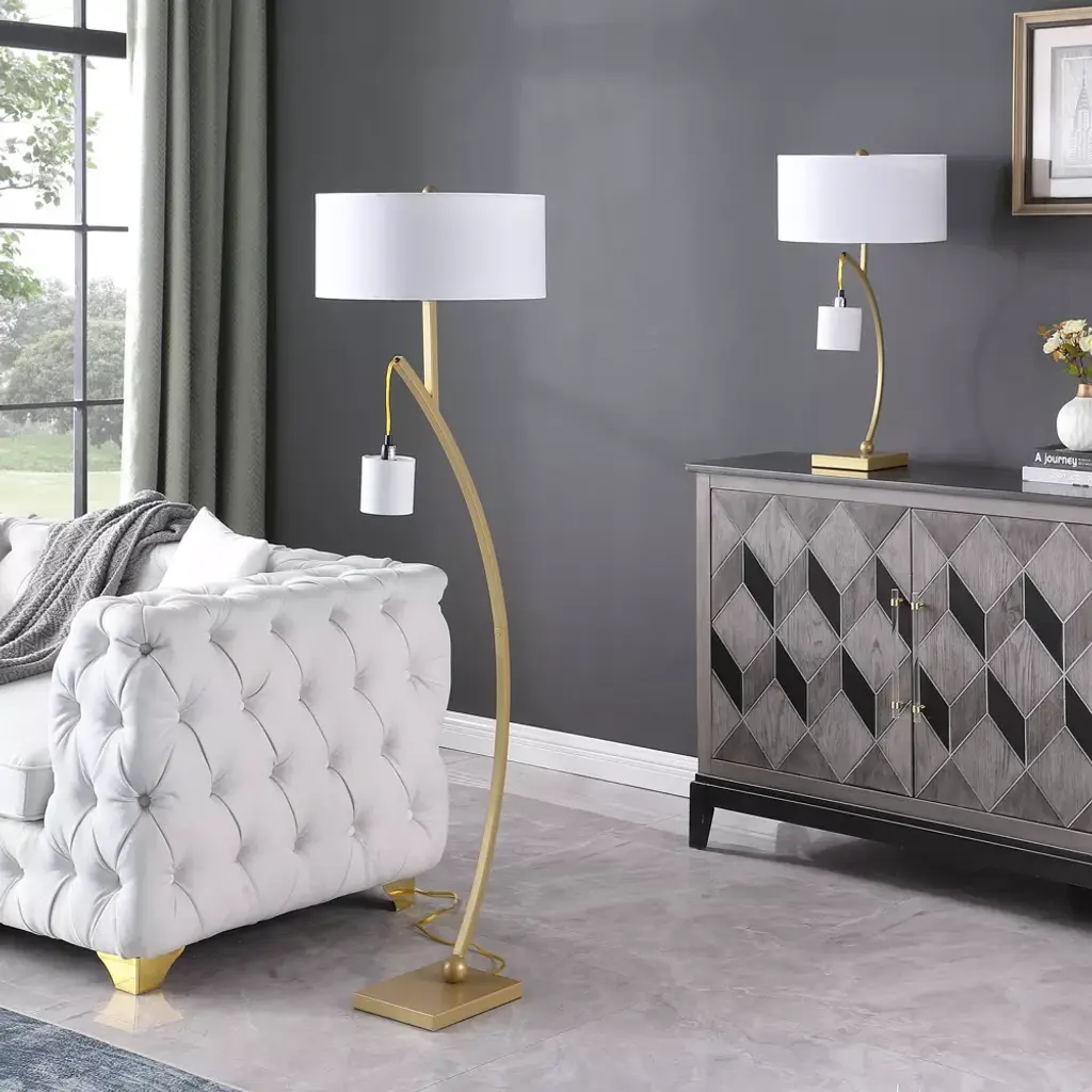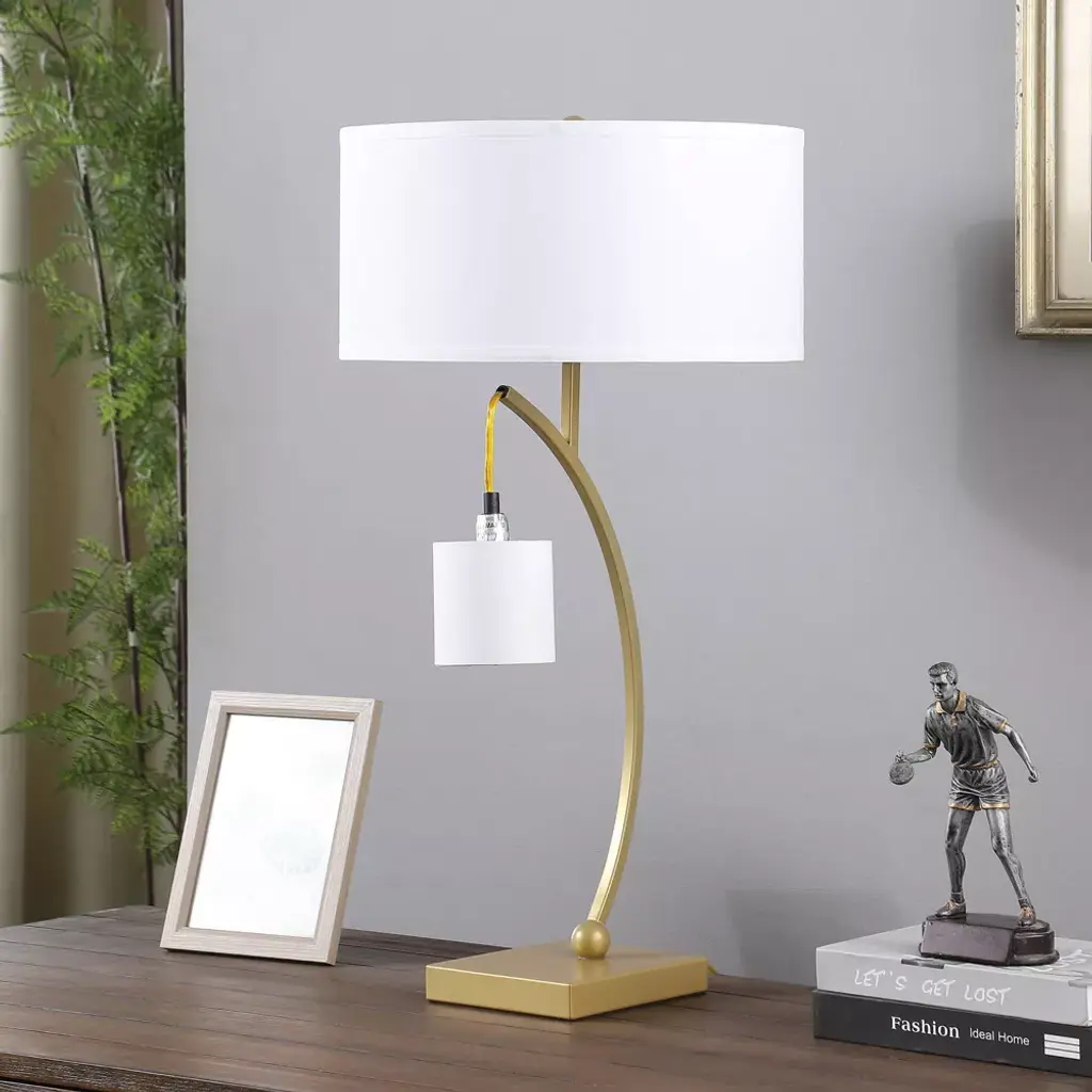 Ore International 28.5" Contemporary Arc With Hanging Pendulum Metal Table Lamp Gold : Dual Socket, Linen Shade