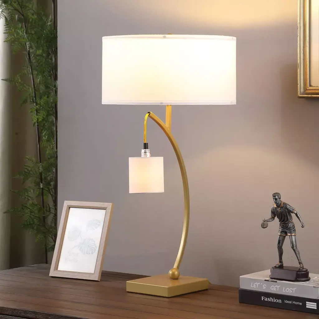 The Contempory dual of this table lamp could just as easily reference what happens to people who see it up close for the first time - they stop as they consider the careful balancing act performed by metal-forged into gentle curve and counterbalanced by the pendelum reading lamp. Illuminate your decorative taste with this metal forged Arc Table Lamp. Beautify your home or office with this transitional table lamp, simple yet impactful design elements provide the perfect balance of form and function. Finished in a matte gold finish, and featuring a soft white dual drum shade, the arc supporting arm of Structure allows for focused yet out-of-the-way illumination for reading or other deskside tasks. The single light model rests at 28.50 inches in height and features an additional reading light for a desktop space-saving footprint. The dual light model provides just the right amount of ambient light to illuminate your workspace from an office or den.