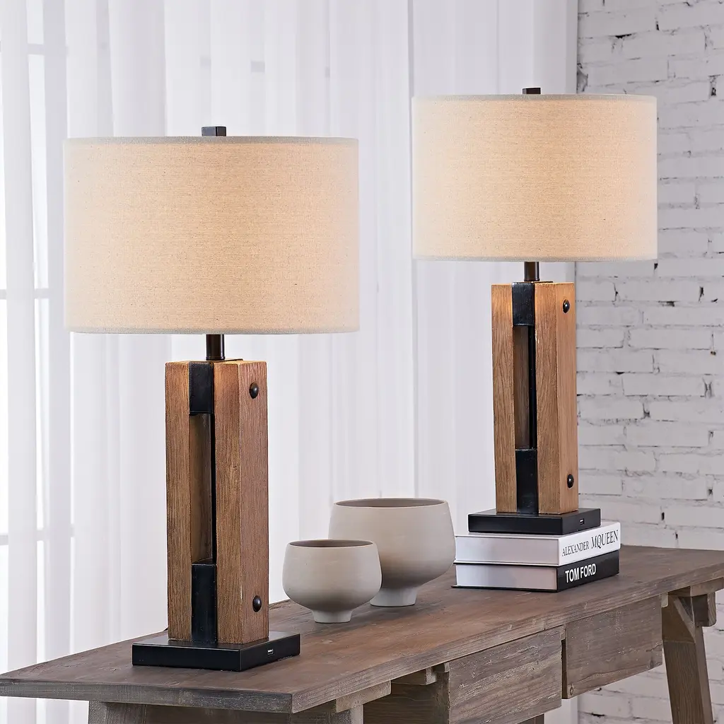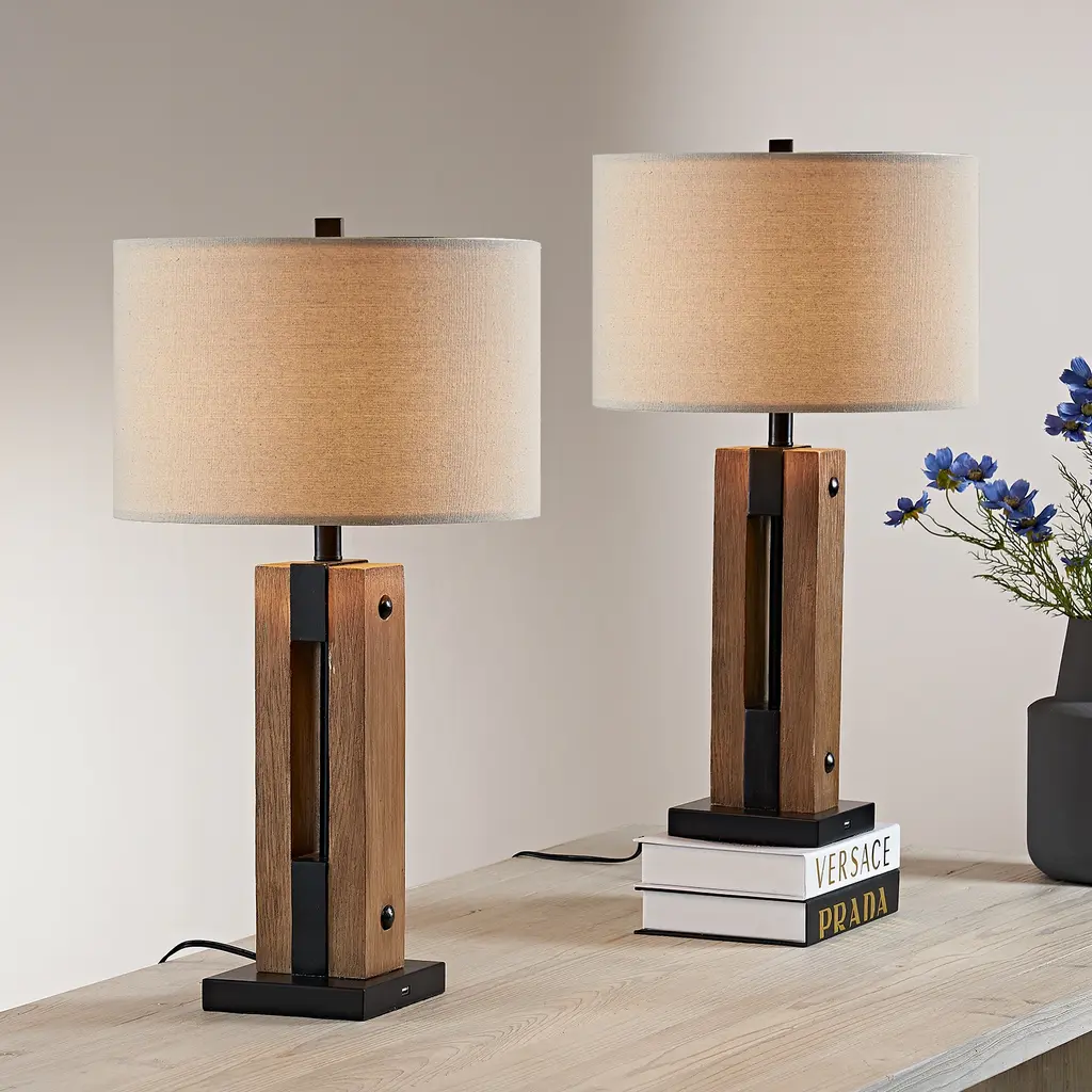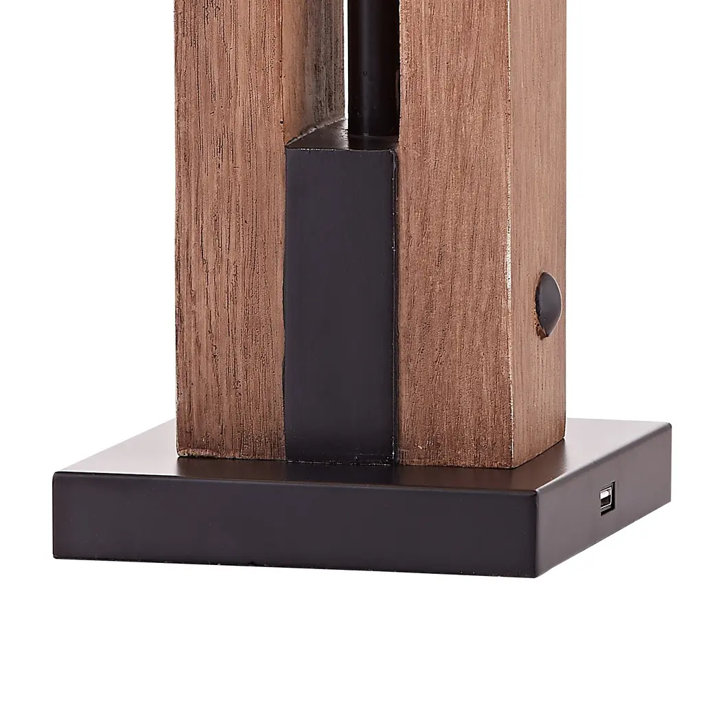 Bring rustic style to your living room, bedroom, or home office with this set of 2 lamps. We love that each lamp has a USB port on its base, so you can keep your favorite devices charged. Each lamp is made of resin, with a black square base and a rectangular body in a woodgrain finish, offering distinctive contrast. It has a simple 15” diameter drum shade made of oatmeal fabric. A three-way switch on its socket helps you find just the right level of illumination; add a dimmer switch (not included) to further set the mood. Features: