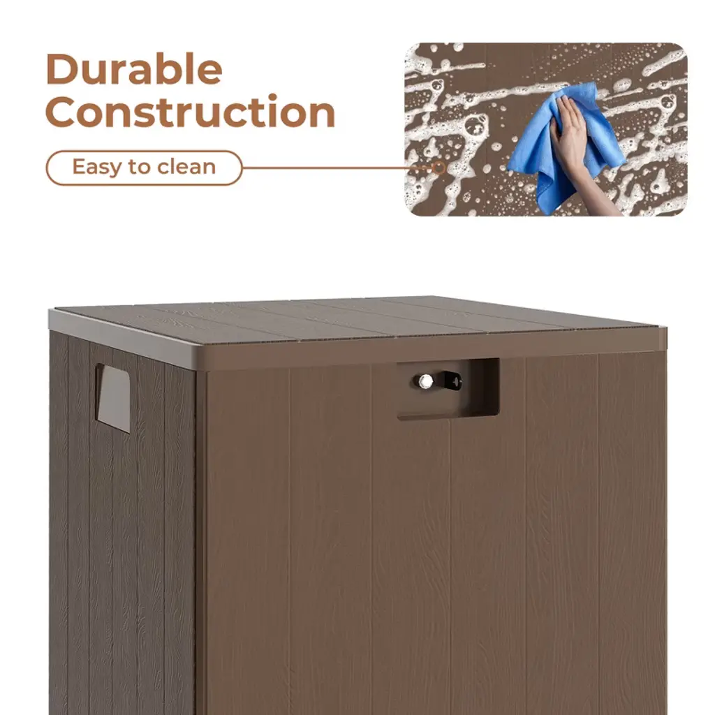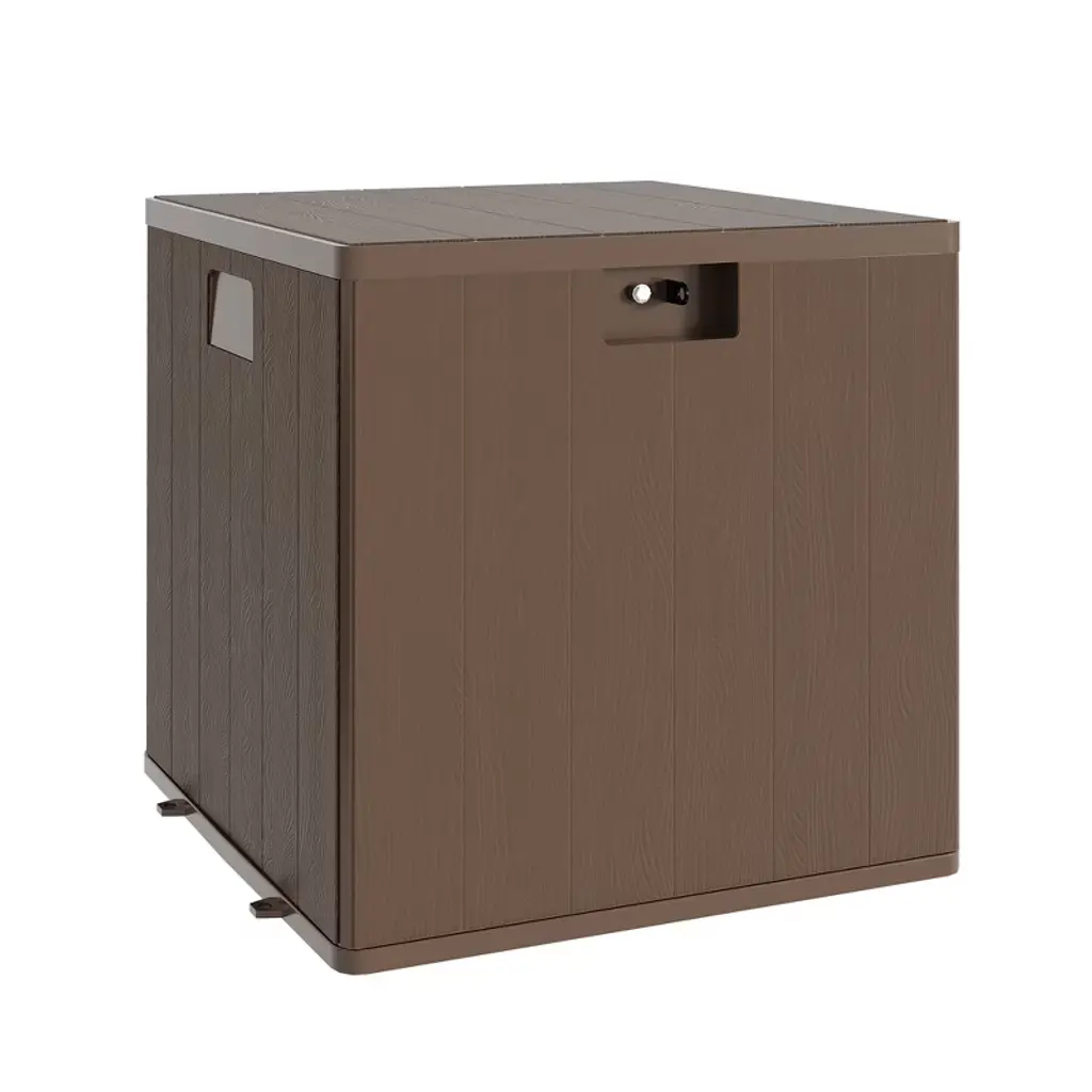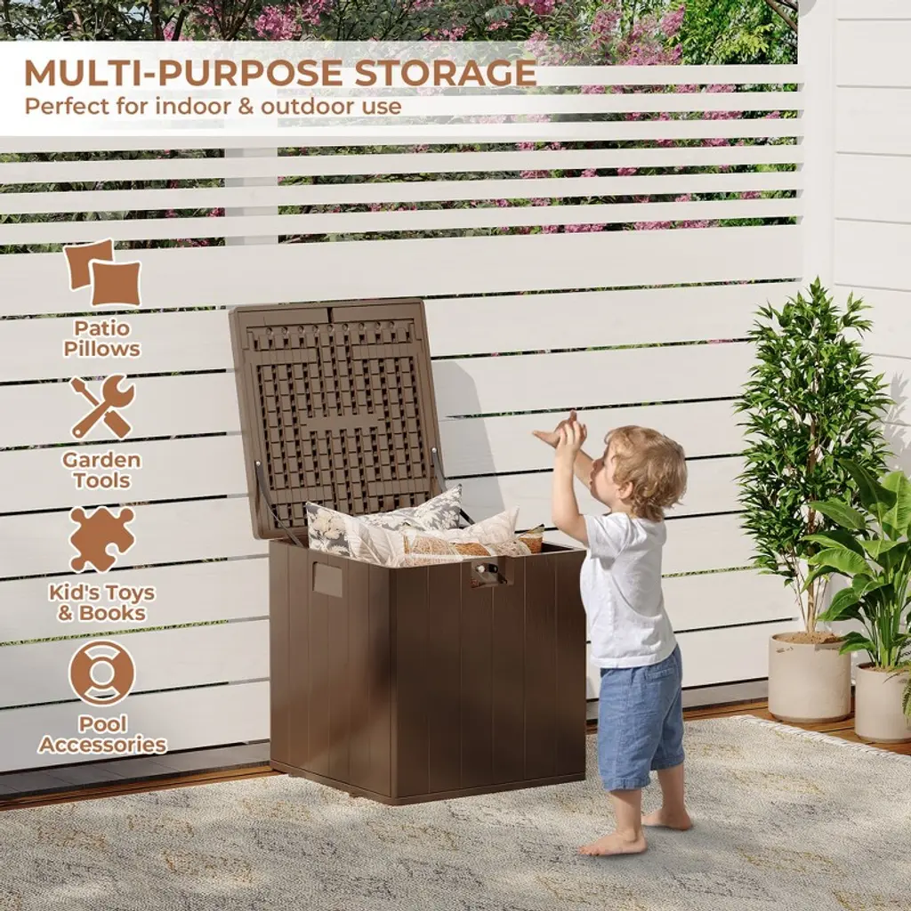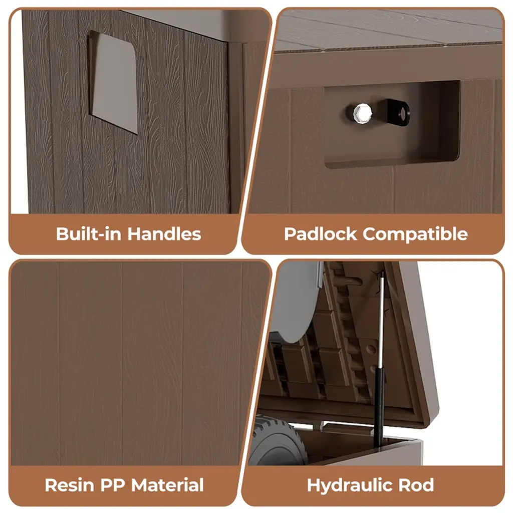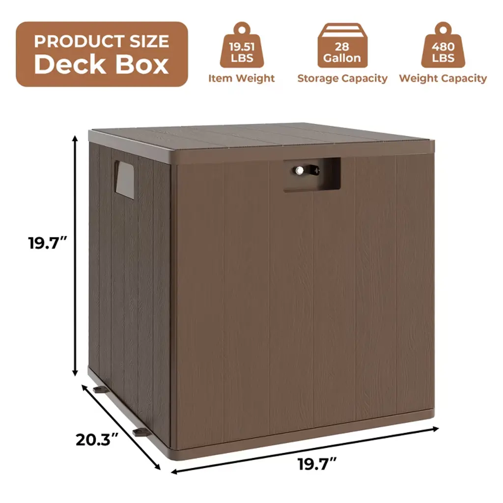 ALL-WEATHER PROTECTION - This resin deck box features an all-weather design with an aggregate resin and wood grain pattern. This combination offers a perfect blend of beauty and utility. It ensures protection against water, UV rays, fading, rust, peeling, and warping. As a result, it requires minimal maintenance in the years to come. Whether it's the sun-drenched summer or the stormy winter, your items will be safely stored and remain in pristine condition VERSATILE IN EVERY SETTING - It's the perfect place to store outdoor toys, pool accessories, cushions, garden tools, and beach towels. Moreover, waterproof patio storage box can serve as a side table, patio seat, storage bench, or footstool CONVENIENT DESIGN - Equipped with two gas rods, it opens easily and closes slowly, preventing hands from getting clamped. Our deck storage box also features ergonomic side handles on both sides, making it easy to lift and move. Additionally, you can enhance security by adding a password lock or a small lock (not included) to the top cover LARGE STORAGE SPACE - This waterproof outdoor storage bench seating deck box boasts an 28-gallon capacity. It can hold small items such as gardening tools, pool supplies, sports equipment, or other outdoor items, ensuring that your backyard, pool, and lawn stay neat and tidy EASY ASSEMBLY & EXTRA SEATING - Our lockable patio outdoor storage box features a KD (knock-down) design, similar to building blocks, which makes assembly a breeze. Just one person can easily assemble all the panels together without the need for any tools. This versatile deck box can double as a seat or a table, with a weight capacity of up to 480 lbs. Use it as a single patio seat, a convenient coffee table, or even a sturdy footrest for both indoor and outdoor spaces