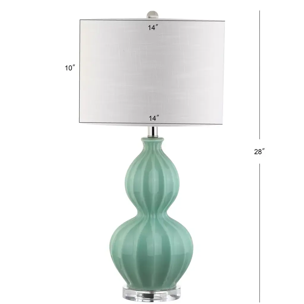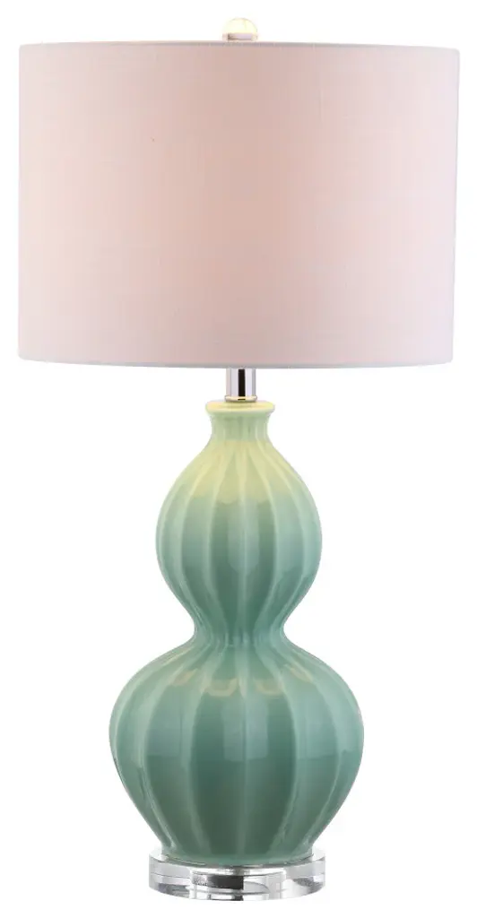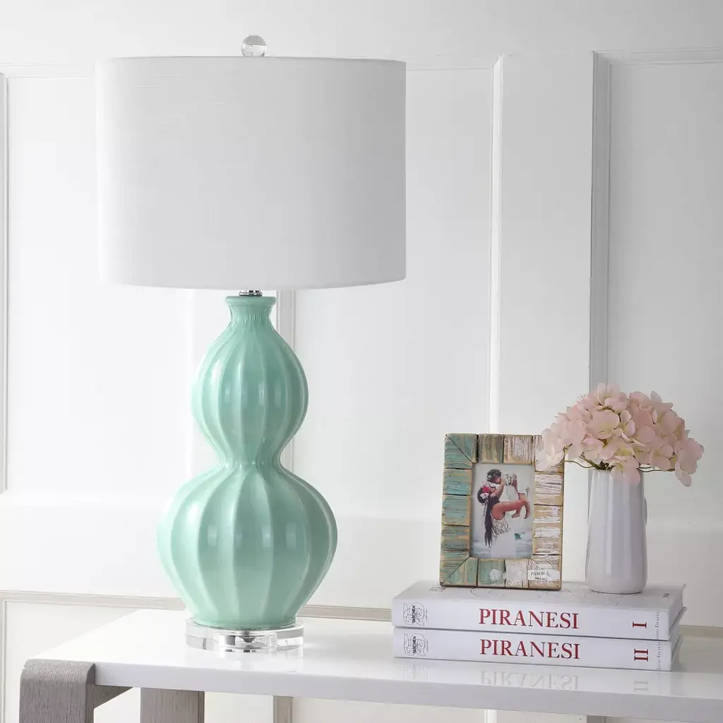 The classic midcentury double-gourd gets a feminine update in this fluted glass table lamp. Tall and narrow, it's ideal scale for nightstands and console tables without much surface area. Add a welcoming glow by using it as a colorful accent, and feel good about turning it on – it’s compatible with all standard A19 bulbs – including LED bulbs.