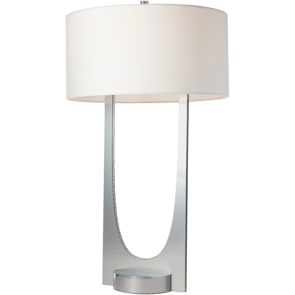 This contemporary table lamp from Cal Lighting is a great piece of decor above a nightstand or side table. It features a sturdy brushed steel frame with a conical-style LED night light. This lamp ships complete with a round white fabric shade.