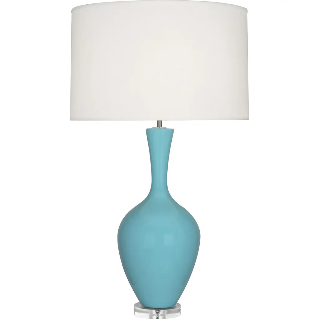 Materials: Polyresin, Metal and Clear Acrylic Base + Cotton/Linen Shade, Finish: Teal Pebble Pattern Polyresin Bulbs: Requires 1 pc 100-watt Max, A19 Shape Type A (E26) Incandescent, CFL or LED Compatible, Fully assembled Semi Drum White Shade measures 15" L x 12" W x 11" HTeal Pebble Pattern Polyresin Table Body measures 7.5" L x 7.5" W x 13.5" H, Acrylic Clear Round Base measures 5.75" L x 5.75" W x 1" H Input Voltage: 110-120V, Silver Cord measures 60" L, On/Off Rotary Switch located on the Bulb Socket Silver Chrome Harp measures 4.75" L x 0.15" W x 10" H, Solid Chrome Round Finial measures 1" L x 1" W x 1" H UL listed. Imported; Wipe with a damp cloth for cleaning
