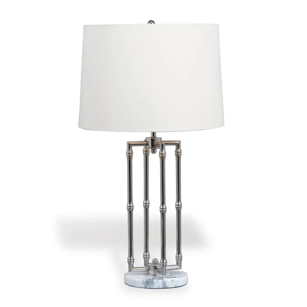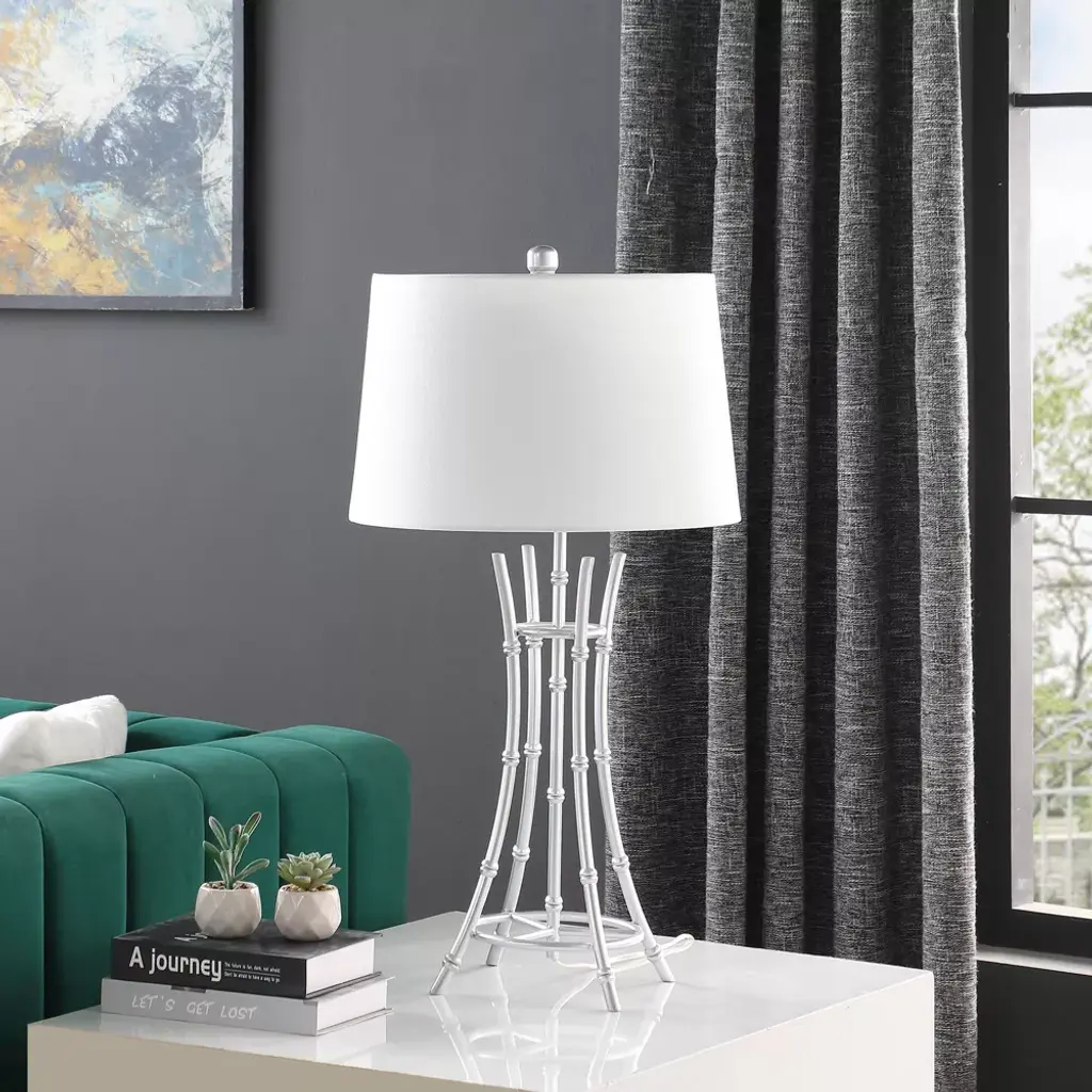 Introduce layers of illumination into your bedroom or living spaces with the Kiara Bamboo Table Lamp. The four legged bamboo stems adds dimensional intrigue to a bedside table or living room side table. The slender and sturdy metal rod and round base complement the vertical open bamboo weave. This Kiara satin brushed silver shines with tropical-inspired elegance, offering natural enhancement in modern, bohemian, or eclectic decors. This bedside lamp built-in wave-shaped bamboo stems are made from high quality metal with a satin brushed silver finish. Gives you a simple and unique visual impression and bring a stylish look and glaze surface for your house. Give your space decor a standout lighting update with this metal and bamboo table lamp.
