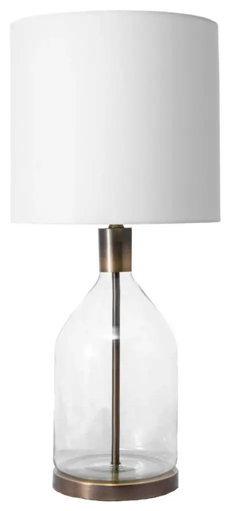 Constructed with durable materialWeighted base for better balanceclear molded trextured glassMetal antiqued brass finish baseBulb Type: Incandescent or CFLBulb Wattage: 150Number of Bulbs: 1Bulbs Included: NoHardwire or Plug: No