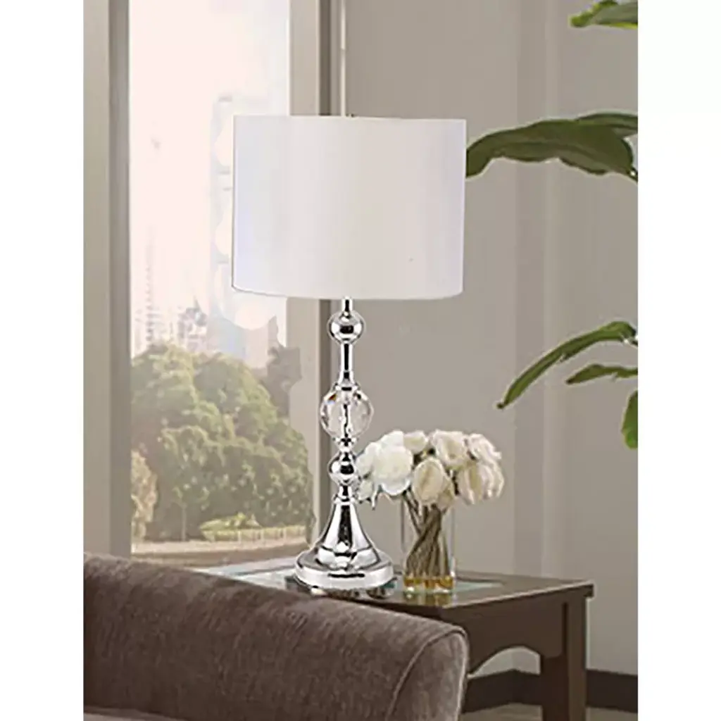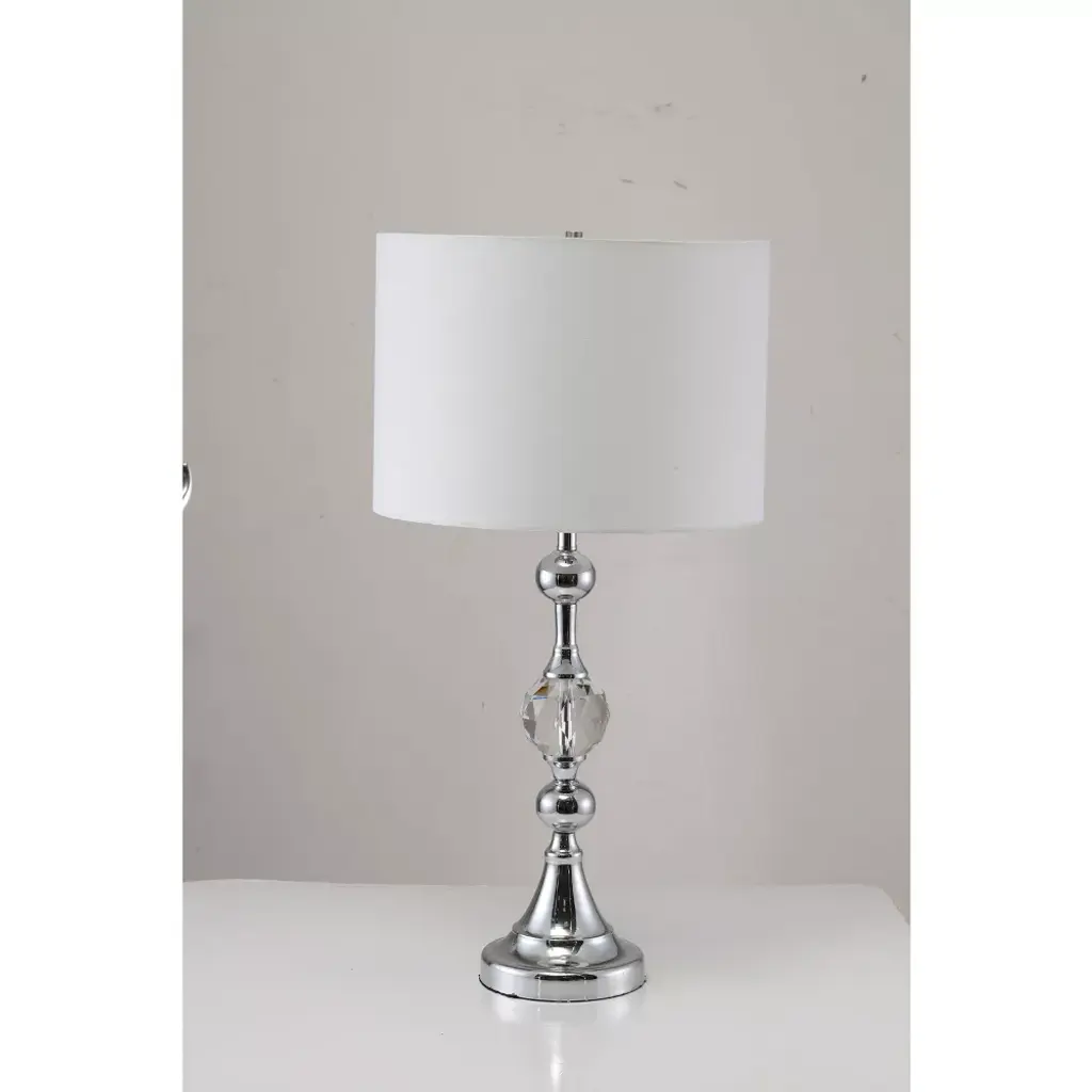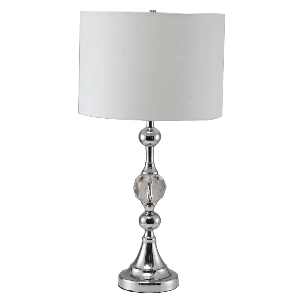Sensual curves emphasize the romantic feel of crystal glass, offering an artistic and elegant ambiance. With a chrome metal profile and crystal glass design, this contemporary Leona table lamp has a stunning and lavish quality. It has an integrated built-in outlet that allows you to charge a phone or small electronic device. Update any space instantly by adding this glam crystal glass table lamp. The sensual curves profile adds lovely detail, also serving as the base for a sphere detail. The base of this distinctive modern table lamp is made from a triple crystal orb, with grooves and ridges at the top and bottom, and a sleek round base for support. A K/D white linen drum shade tops off the design beautifully and creates a pleasing, soft glow.