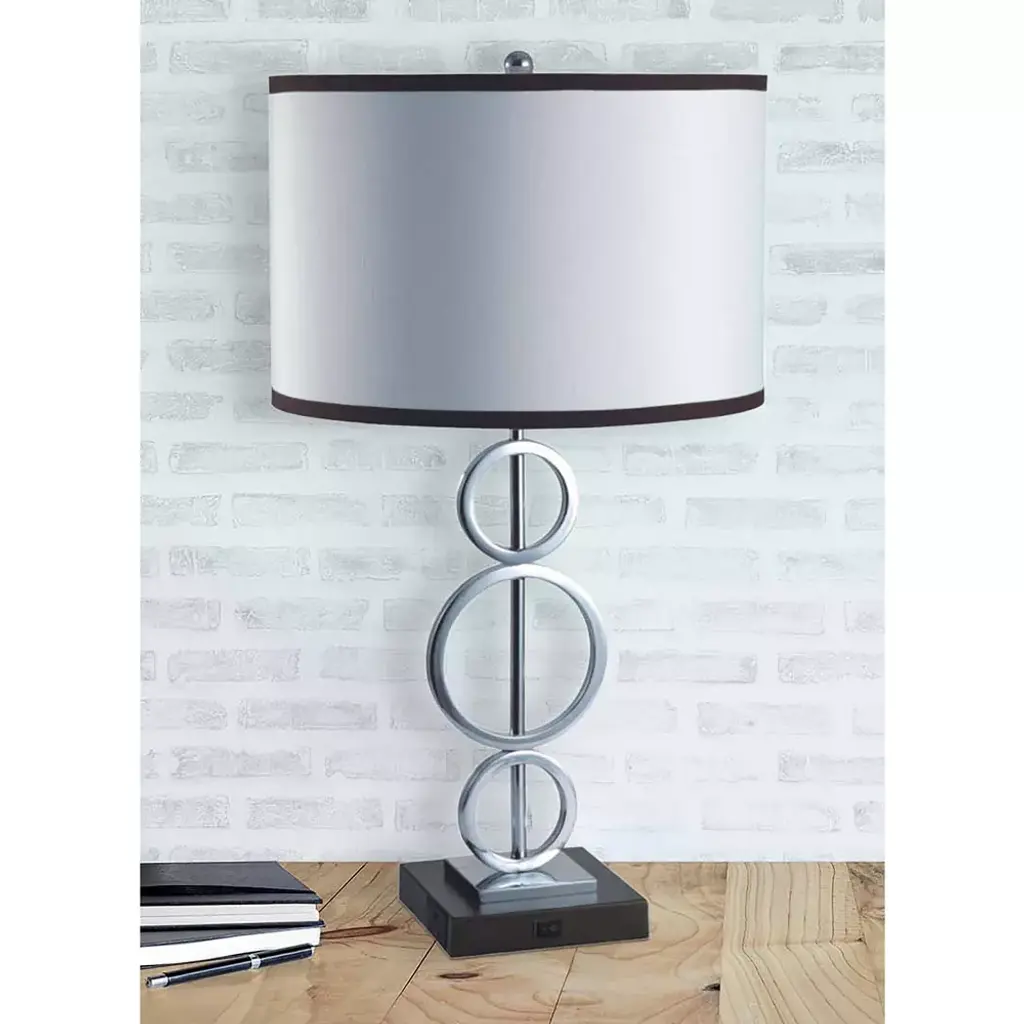 This modern style lamp comes in silver finish, and a white with black trim rounded shade. It features sturdy metal construction. This contemporary table lamp will illuminate any room in your home with a convenient outlet to connect your favorite smartphone, notebook or tablets. This item does not ship to Puerto Rico.