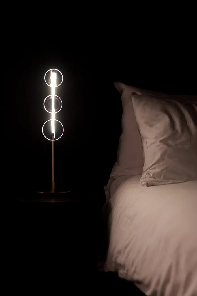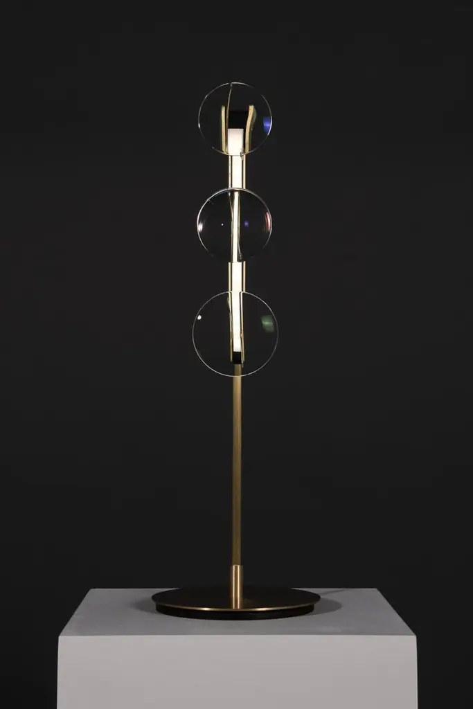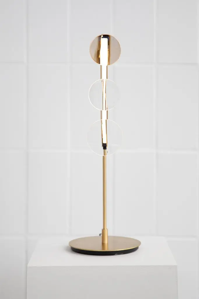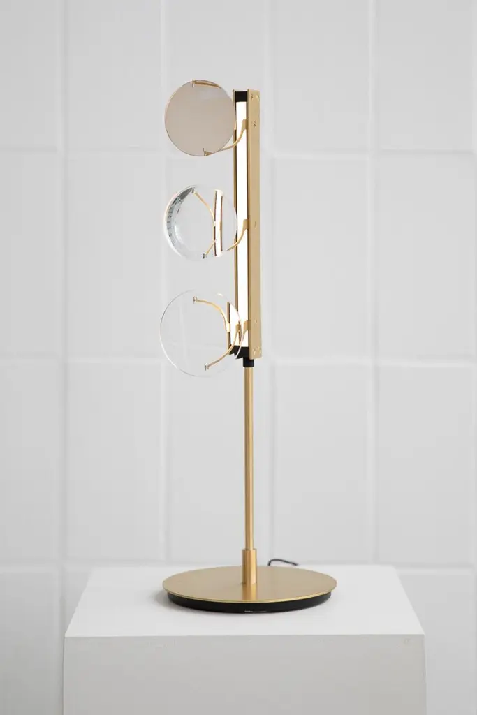 3-Lens table lamp by Object DensityHandmadeDimensions: Ø16 x 48 cmMaterial: Brass (Messing), Optical lenses, Dimmable 12V LEDThrough a close inquiry into an optician’s process and production, Object Density have realised the opportunity to redefine an element of waste. The Lens Luminaire seeks to reinstate the value of imperfect optical lenses, by highlighting their inherent beauty and unique distortive qualities. De Admirant, historically known as De Bruine Heer, formerly served as the Philips design head-office, and is one of Eindhoven’s most iconic buildings. Now standing at the foot of the building is an optician & coffee cafe. Drawing upon the city’s history of lighting innovation, New Objectivity architecture, and the re-contextualisation of a waste stream, The Lens Luminaire is the tangible convergence of inspiration. As a physical expression of Eindhoven’s city culture - past and present, we reflect upon how this interplay may shape its future.Object Density is an Eindhoven-based design studio established by Nicola Charlesworth and Kim Stanek. Originally from Australia, the duo moved from Sydney to Eindhoven in 2019 to immerse themselves in Dutch design culture while founding their studio. Object Density creates artistic objects of use, drawing upon research and cultural narrative to communicate values of sustainability and community. Often integrating waste or discarded materials, they seek to reinstate value through the conscious process and material decontextualisation. Through examination of object typologies, materials and processes of the past and future, Object Density believes that a designed object can be ‘dense’. Dense with the tacit knowledge of those who contributed throughout the design process.