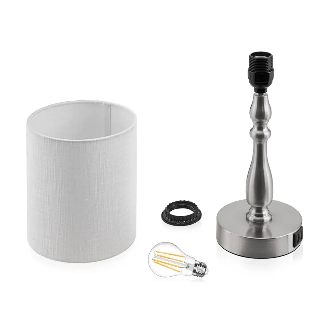 Simple yet Sophisticated modern small table lamp with great functions: Touch 3-way switch and 2 build-in USB ports. It offers 3-level brightness options(Low, Medium, High), has 2 built-in USB charging ports, 5-Volt 2.1 Amp for you to charge your mobile phones, iPads, laptops, tablets, kindle and other electronics at the same time, also save your space from cluttered electric cords and chargers. in addition, a LED bulb is included which is 6W 2700K 600 Lumens brightness. A nice choice for bedside table lamp for bedrooms