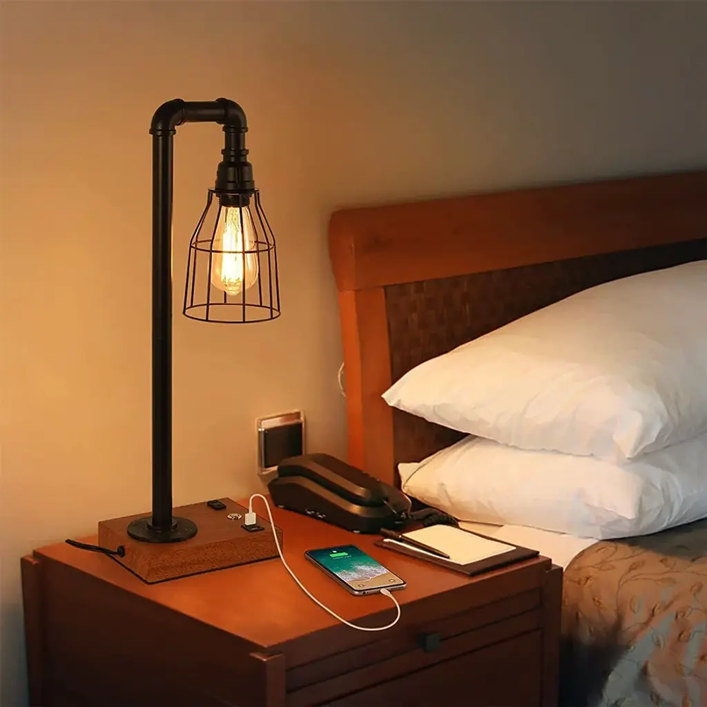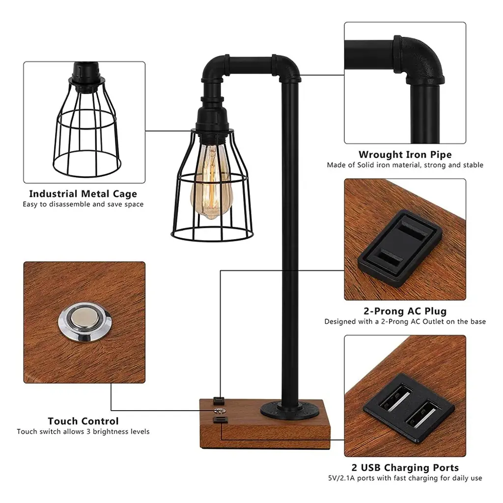 3 Way Dimmable Touch Control: Our antique desk lamp comes with 3 levels of brightness options (low, medium, high), just tap the touch dimmer button on the lamp base to adjust the lighting to meet your comfortable brightness needs for study or work, which sensitive touch function makes it very user-friendly Convenient AC Outlet Dual USB Ports: Built-in dual USB charging ports (5V/2.1A) on lamp base. Convenient to charge your devices. Such as mobile phones, tablets, kindle readers, speaker, diffuser, and other electronic devices. These USB ports can be used regardless of whether the lamp is on or off. Besides, a useful AC power outlet was added on the base. Please note: don't use the electric appliances with power more than 800W. Industrial & Fashion Design: HAITRAL industrial table lamp features a black metal pole, metal lamp base and blub shaped metal lampshade, which creates the industrial look and add a touch of aesthetic to any room. The lampshade with bulb shaped metal cage design protect your bulb, more safe and have a new elegant look in your room. Home Decoration: The wrought iron frame design of this desk lamp make it suitable to any room no matter what decoration it is, and its classic and stylish style could catch eyes instantly. This lamp is perfectly to be as a desk lamp, reading lamp, bedside lamp, decorative lamp in bedroom, living room, guest room, coffee table, office. Specification: Voltage: 110V-120V Material: Metal Base & Cage, Wrought Iron Frame Weight: 4.52Lb Style: Industrial / Vintage / Modern Switch Style: Dimmable Touch Control Bulb Requirement: 3 Way Dimmable E26 Bulb