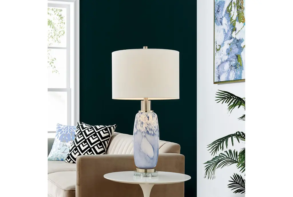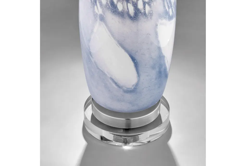 Elevate your home decor with the 30" Blue + White Glass Table Lamp With Acrylic Base. This modern lamp features a stunning blue glass body complemented by a sleek acrylic base, making it a perfect addition to any contemporary space.