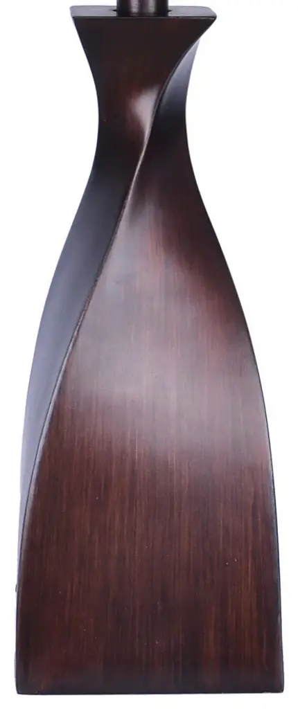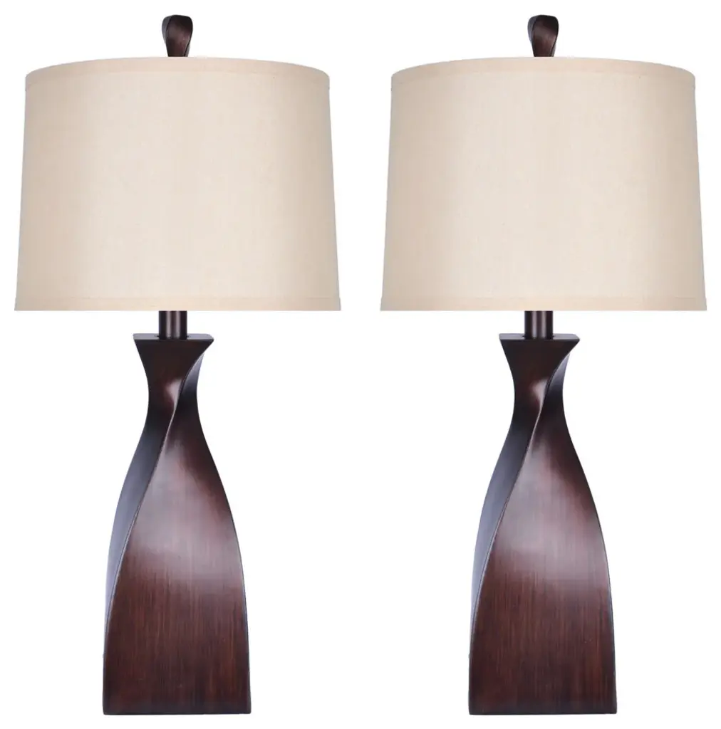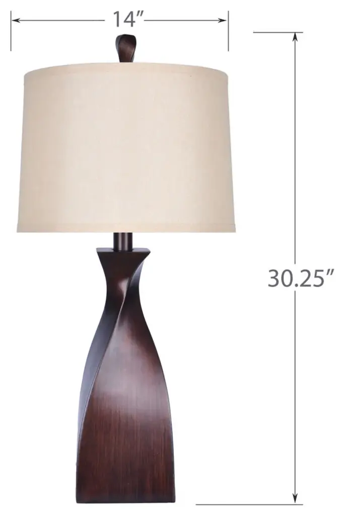 This traditionally inspired set of polyresin table lamps comes with just the right amount of modern flair. Each lamps tapered square base builds into a twisted body with a dark walnut faux wood finish.Each topped by a polyresin finial and a beautiful natural linen shade with self-trim on the top and bottom, these lamps will add warmth and class to any space.Set of two lamps, each is 30.25" tall. Square bases are 6.25" wide. Hardback empire shades are 14" at their widest and are 10" tall.Each lamp uses one 100-watt maximum "A" bulb (not included) and features an E26 socket with a 3-way rotary switch.Grandview Gallery is a moderately priced upscale name you see on the shelves of specialty retailers, online stores and in major furniture retailers around the country. Simplicity, modern, classic, sophistication and elegance best describe Grandviews niche.