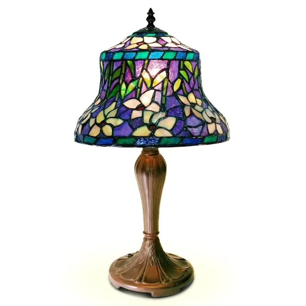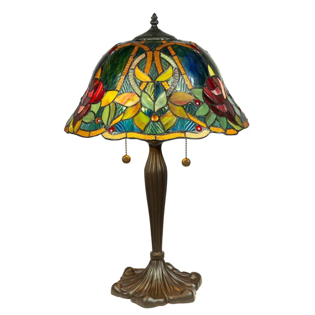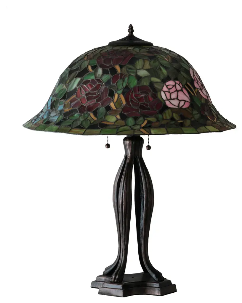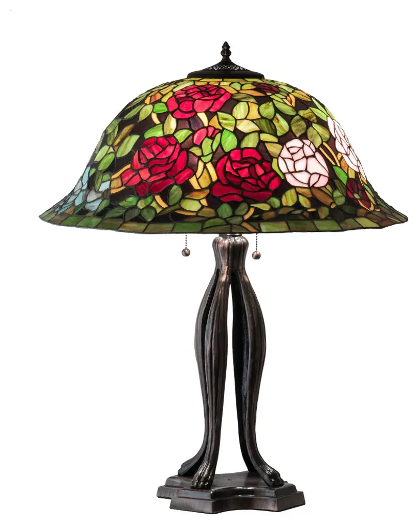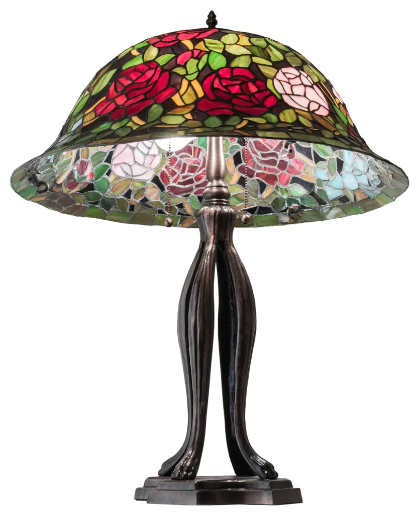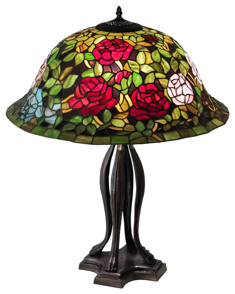 The most beloved of all floral beauties. The Rosebush is beautifully represented in this stunning reproduction of a Tiffany Studio Classic. Petal Pink; Romantic Red and Beautiful Blue art glass Roses ramble on a maze of Garden Green leaves. The shade is created using the famous Meyda Tiffany copperfoil construction. The delicate domed stained glass shade is paired with a Mahogany Bronze finished base. UL and cUL listed for dry locations.