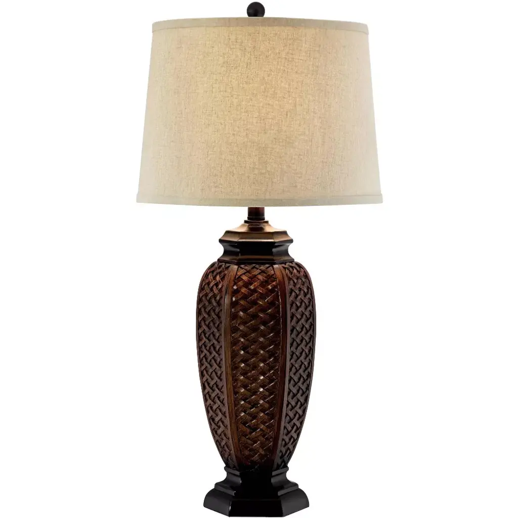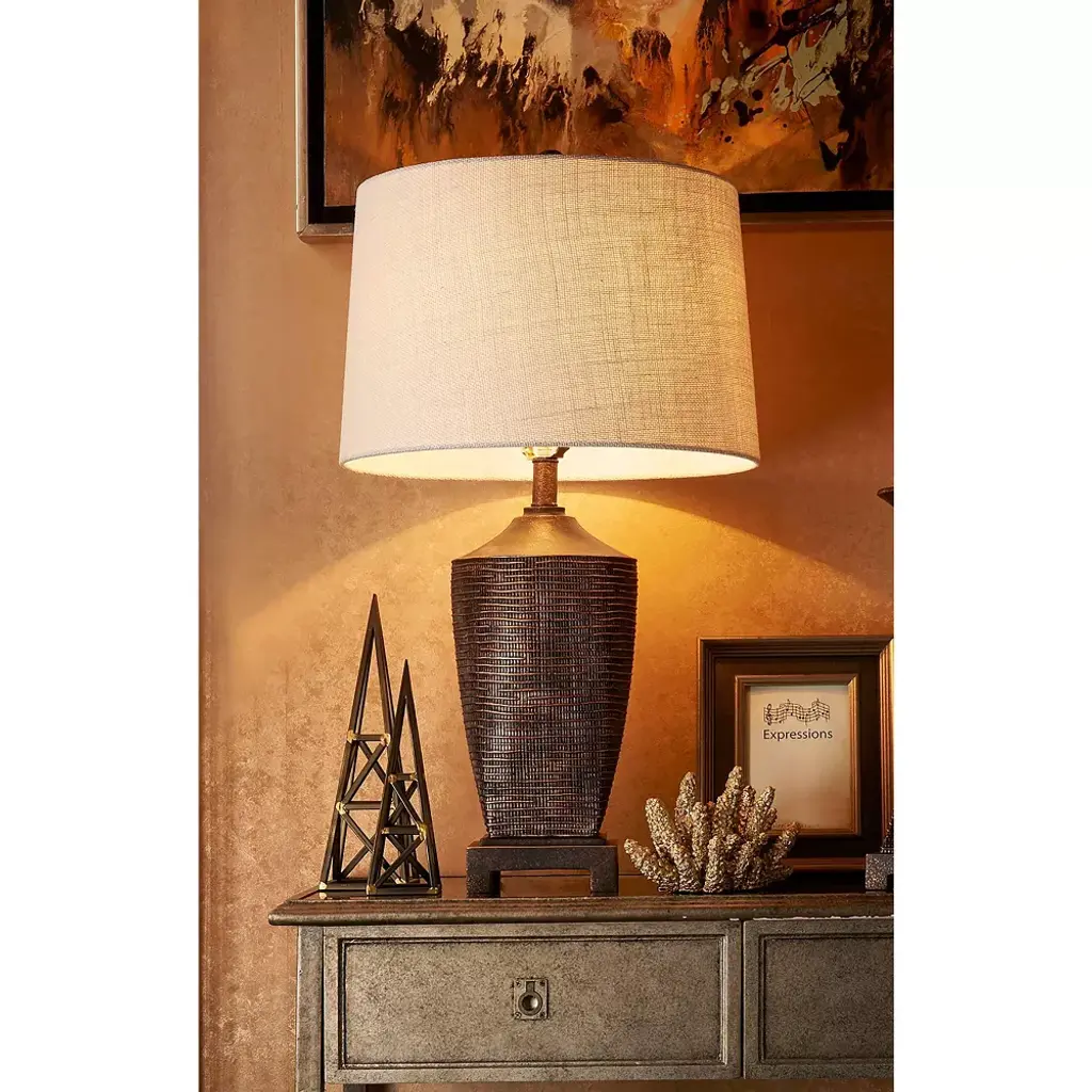 This Polynesian inspired table lamp is distressed with wicker texture to achieve shabby rustic perfection that accent your passion for design and home comfort. This table lamp is a perfect accent for a cozy transitional or rustic home. The table base is shape in solid urn has a wicker texture in a warm bronze finish. The shade is a beige linen drum with textured pattern. Use a pair as bedroom lamps, or add a distinctive look to seating areas. This modernized and luxurious styled table lamp creates a unique effect to the environment and your room. This item does not ship to Puerto Rico.