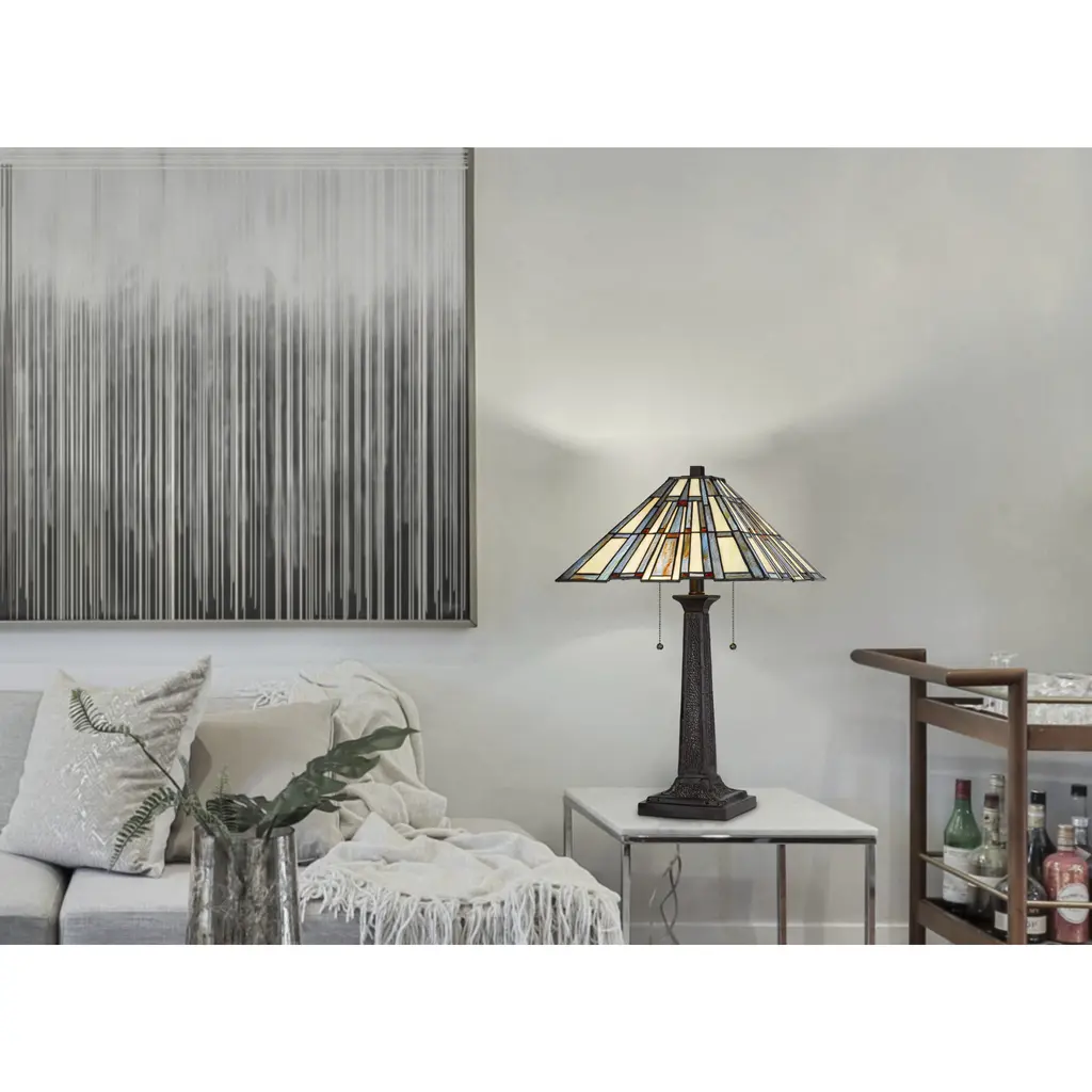 Add a pop of color to your home with this stained glass tiffany table lamp. It features a dark bronze body with metal and resin accents along with a weighted base for added stability. This lamp is sure to make a great addition next to your favorite chair or sofa.