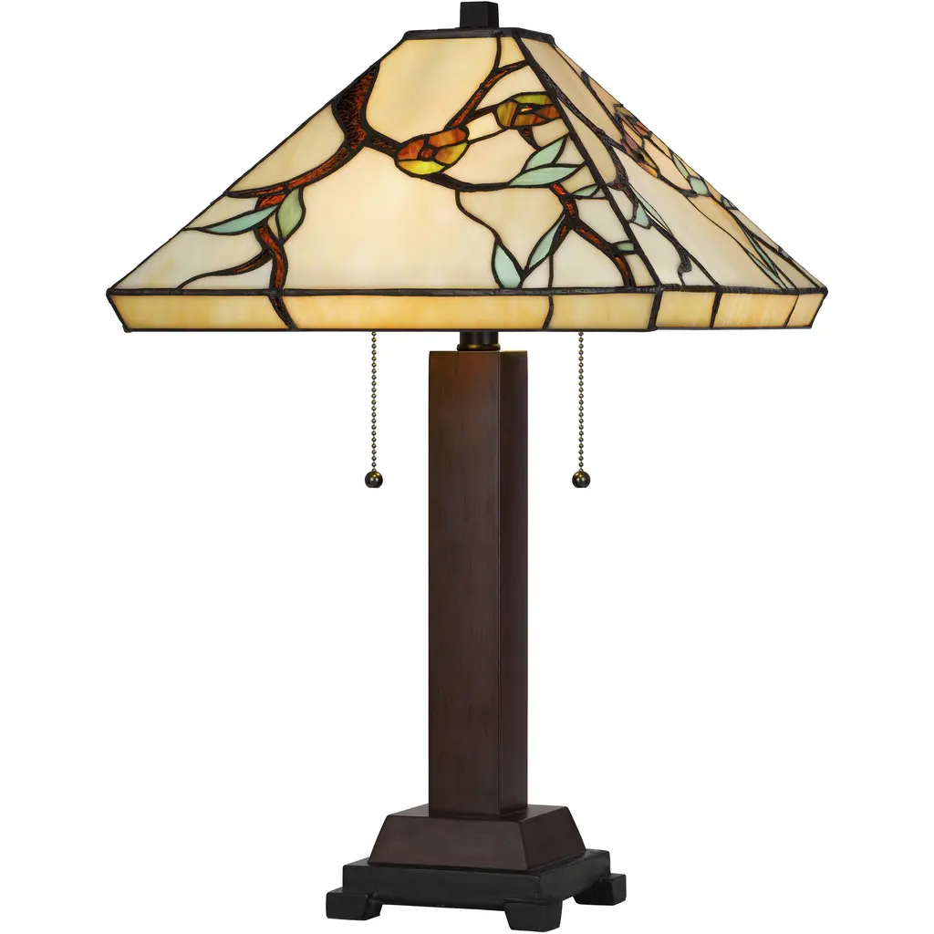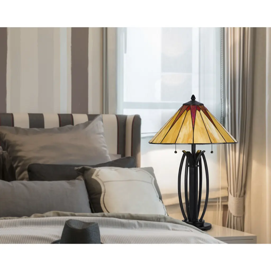 Add a pop of color to your home with this stained glass tiffany table lamp. It features a dark bronze body with metal and resin accents along with a weighted base for added stability. This lamp is sure to make a great addition next to your favorite chair or sofa.