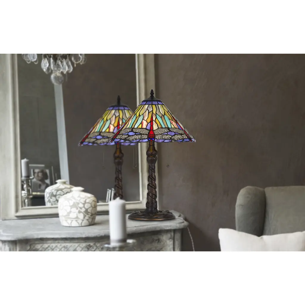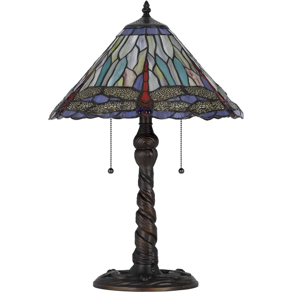 Add a pop of color to your home with this stained glass dragon fly tiffany table lamp. It features a dark bronze body with metal and resin accents along with a weighted base for added stability. This lamp is sure to make a great addition next to your favorite chair or sofa.