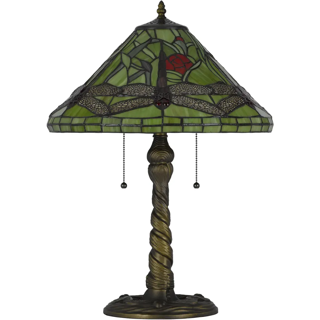 Add a pop of color to your home with this stained glass dragon fly tiffany table lamp. It features a antique brass body with metal and resin accents along with a weighted base for added stability. This lamp is sure to make a great addition next to your favorite chair or sofa.