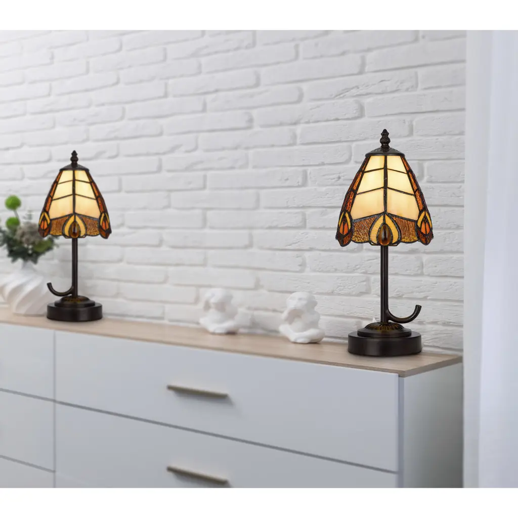 Add a pop of color to your space with this compact size accent lamp. It features a hand painted stained glass tiffany shade with a dark bronze metal/resin base. This small accent lamp is sure to make the perfect addition to any console table or night stand area.