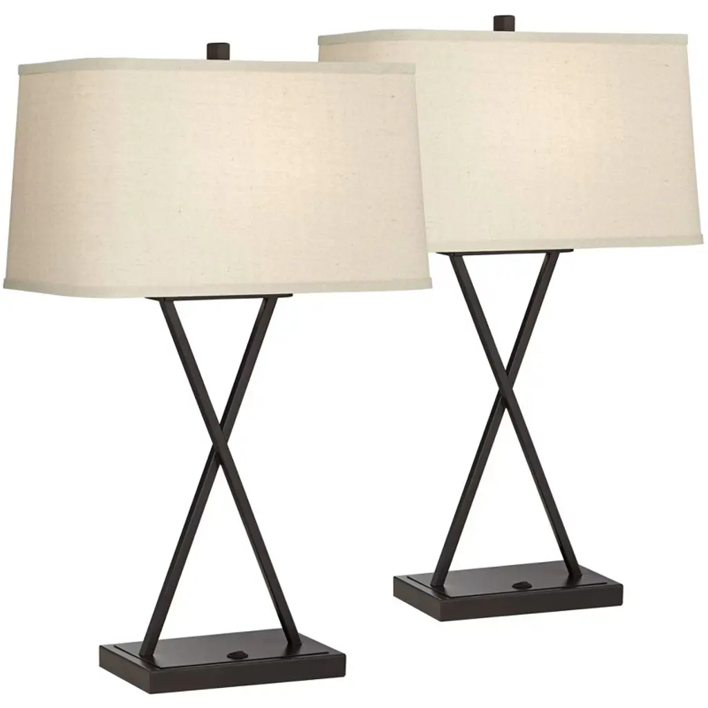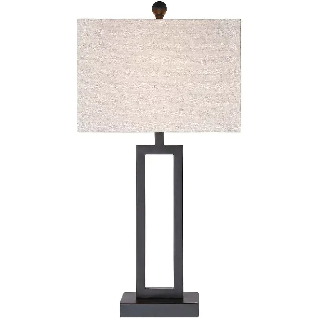Add a designer touch to your favorite room with this set of sleek table lamps. From the 360 Lighting brand, the pair of lamps features a rich black finish and an open, rectangular lamp body. Up top is are off-white rectangular shades.