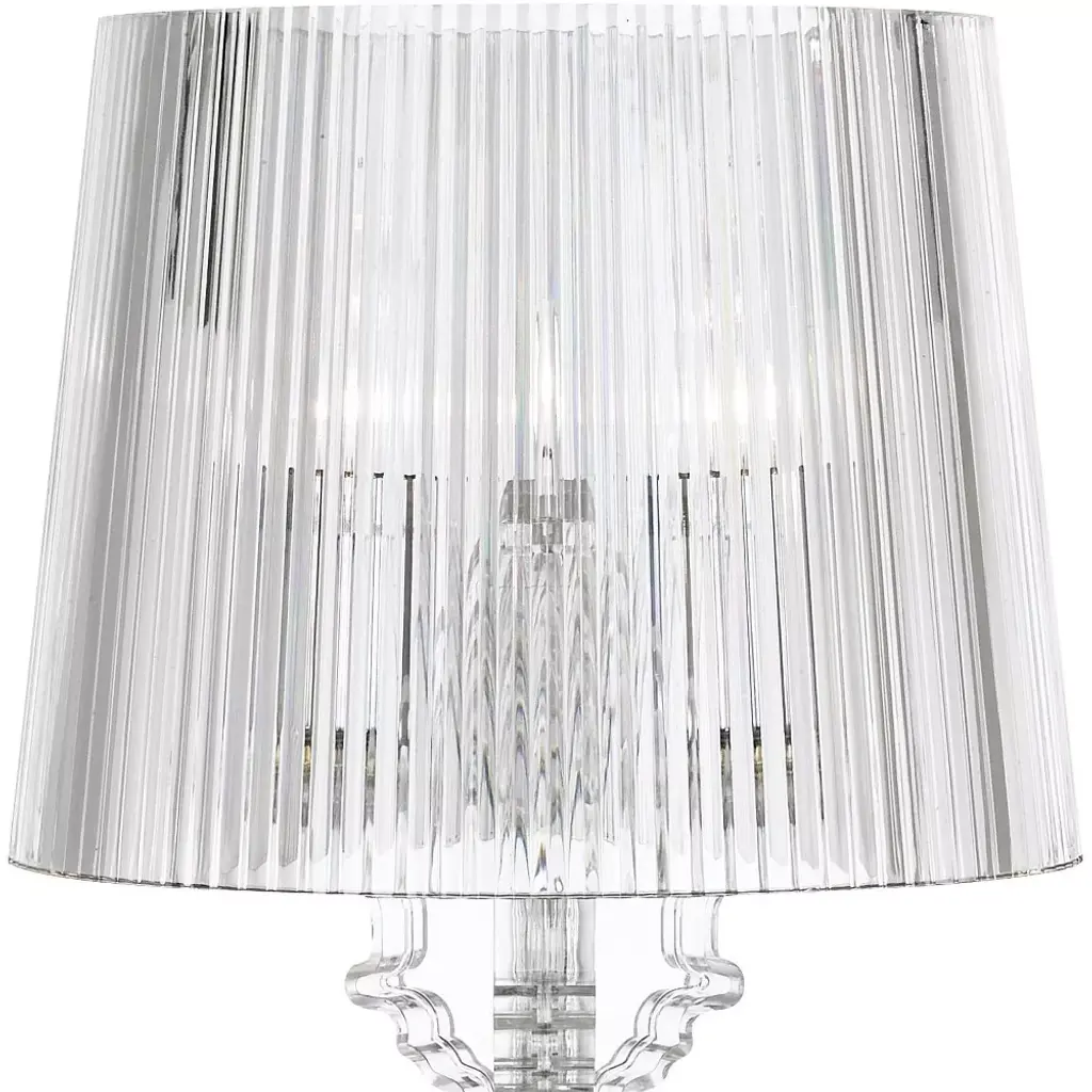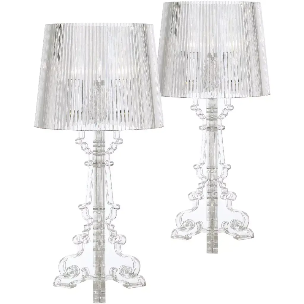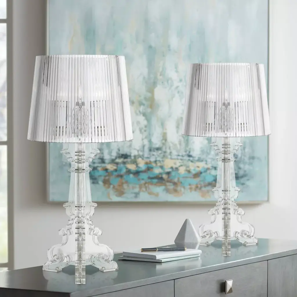Add a dramatic splash to any room with this stunning set of two clear acrylic accent table lamps. The wonderfully complex base features a hint of ornate Baroque style. Both the base and shade are clear acrylic which catch the light beautifully. In-line switch offers accessible lighting control. Add a touch of stellar style and sparkling light effects to your decor.
