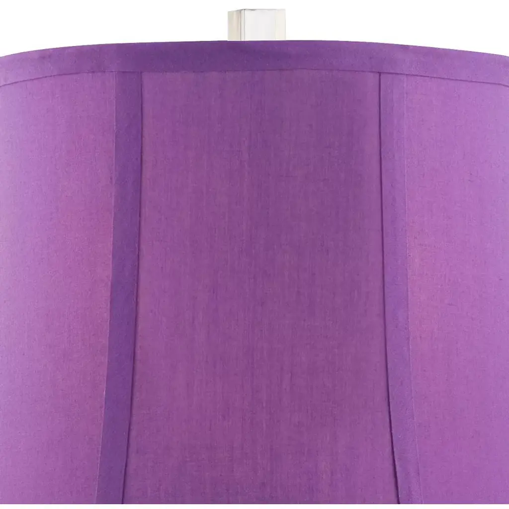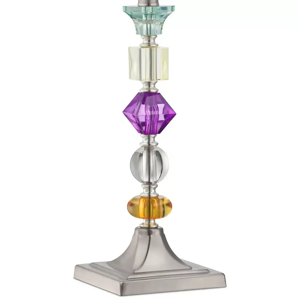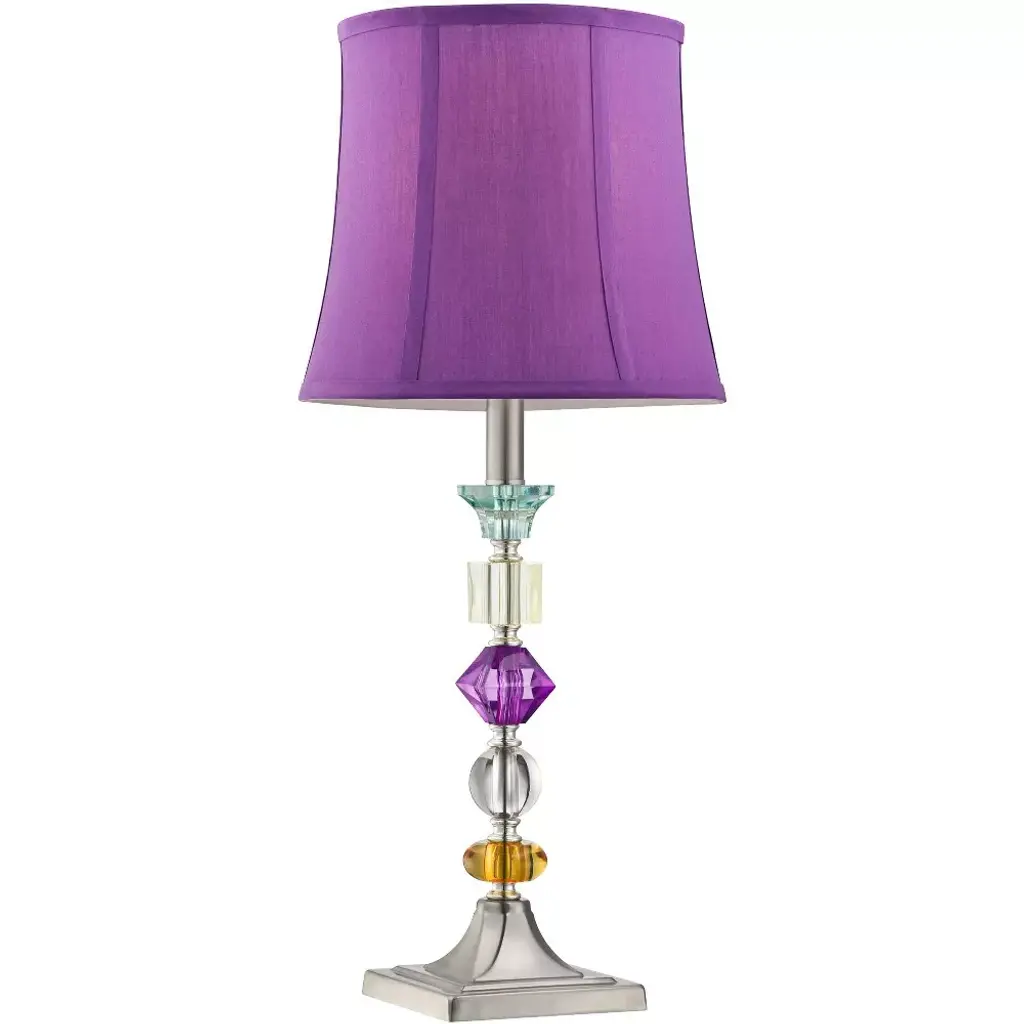 Contemporary lamps add a fun look to your decor. This stylish set of two table lamps is from the 360 Lighting brand. They feature a multi-colored column made up of stacked, geometric form acrylic elements. These colorful elements are set between the square sided base at the bottom and the eye-catching purple fabric shade on top.