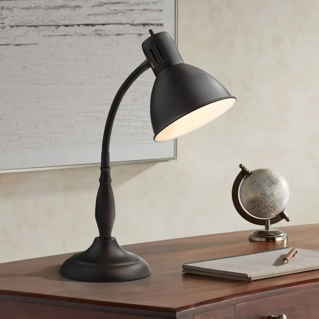 Make your workspace look and feel a bit more refined with this charming desk lamp. The flexible gooseneck arm and metal shade allow for ample downlight so your work area is well illuminated when you need it most. A convenient on-off rotary switch is located on top of the lamp for easy access.